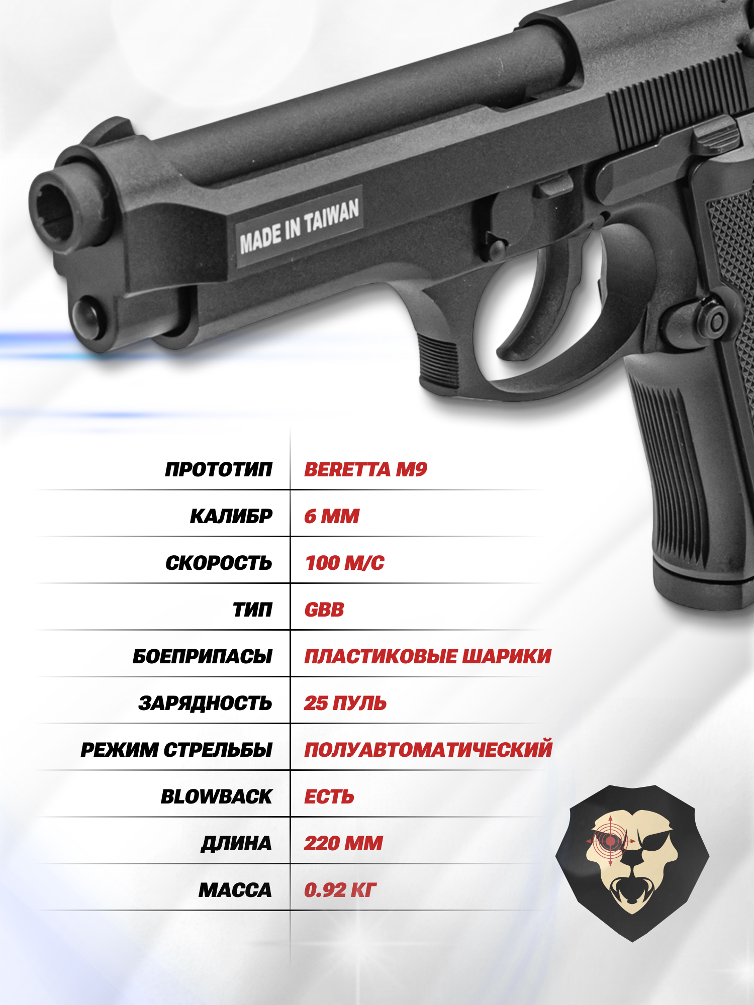 Обозреваемая модель является высокодетализированной копией знаменитого итальянского пистолета Beretta M9, который заменил M1911 и до сих пор стоит на вооружении армейских и полицейских формирований США и ряда европейских стран блока НАТО. Удачная конструкция изделия также пришлась по вкусу в гражданском секторе, ввиду чего различные модификации применяются как для спортивной, так и развлекательной стрельбы.