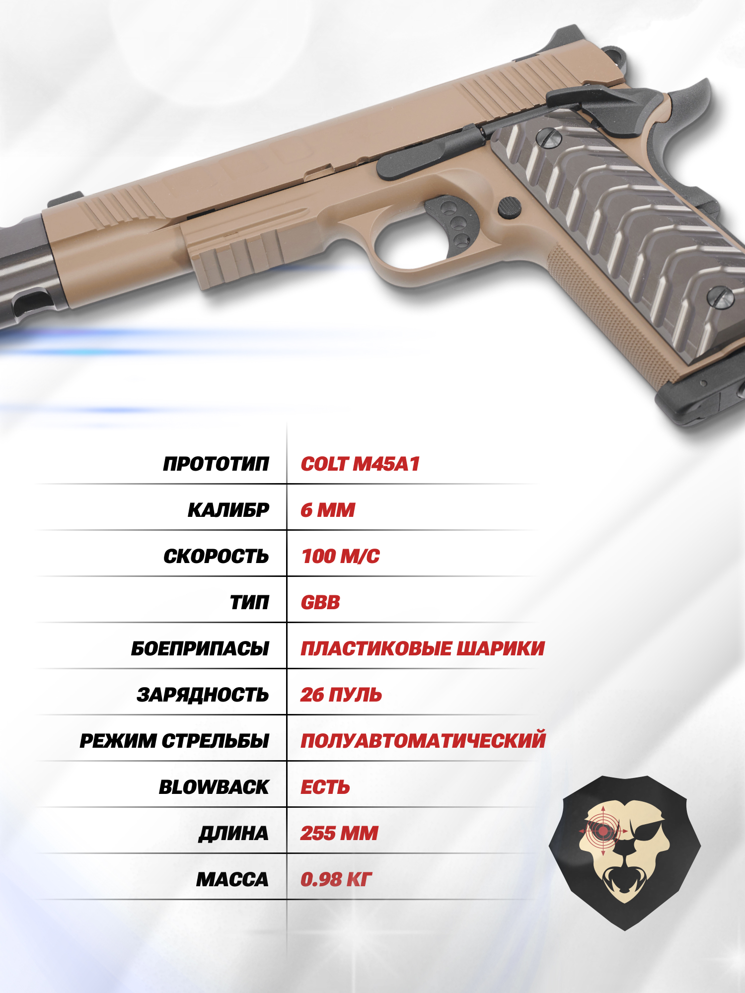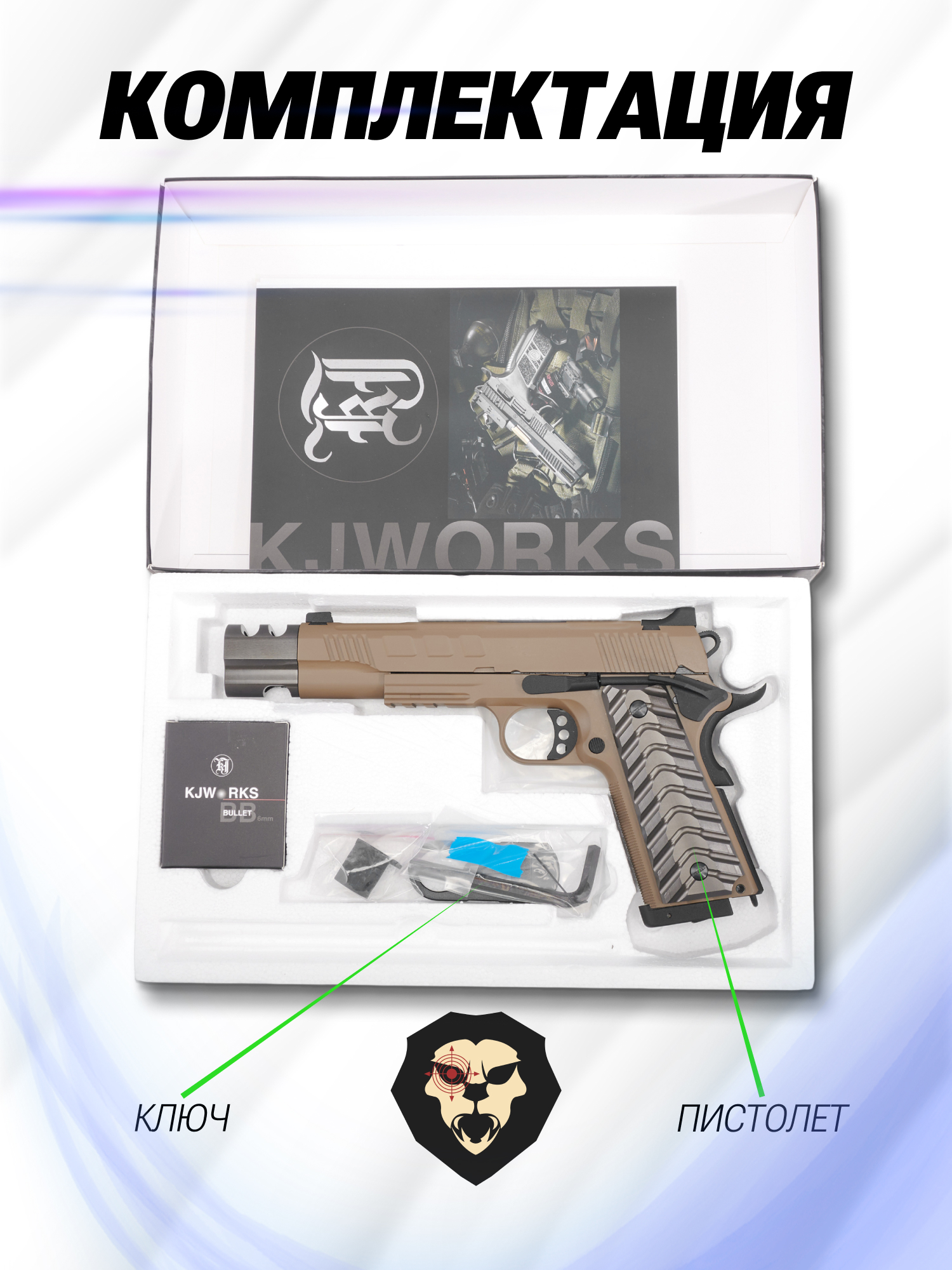 Информация о товаре "Страйкбольный пистолет KJW Colt M1911 FDE (6 мм, M45A1, удлиненный, KP-16.CO2)" носит ознакомительный характер, и не является публичной офертой, определяемой положениями Статьи 437 Гражданского кодекса Российской Федерации, характеристики, внешний вид, цвет и комплектация могут быть изменены производителем без уведомления.