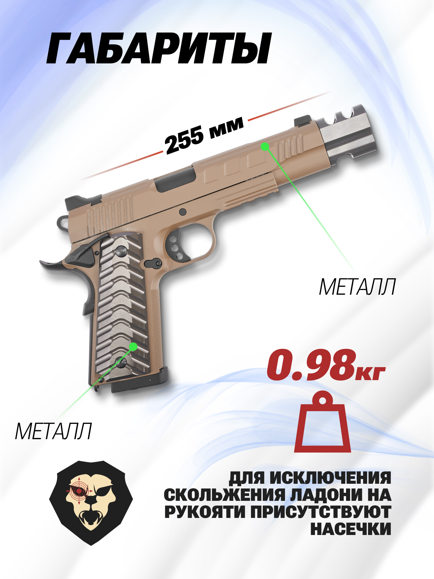 Слайд и рамку пистолета KJ Works изготавливают из металла, что делает изделие надежнее и аутентичнее - масса собранного пистолета в 985 г близка к боевому прототипу. Поверхности окрашены в пустынную расцветку FDE.