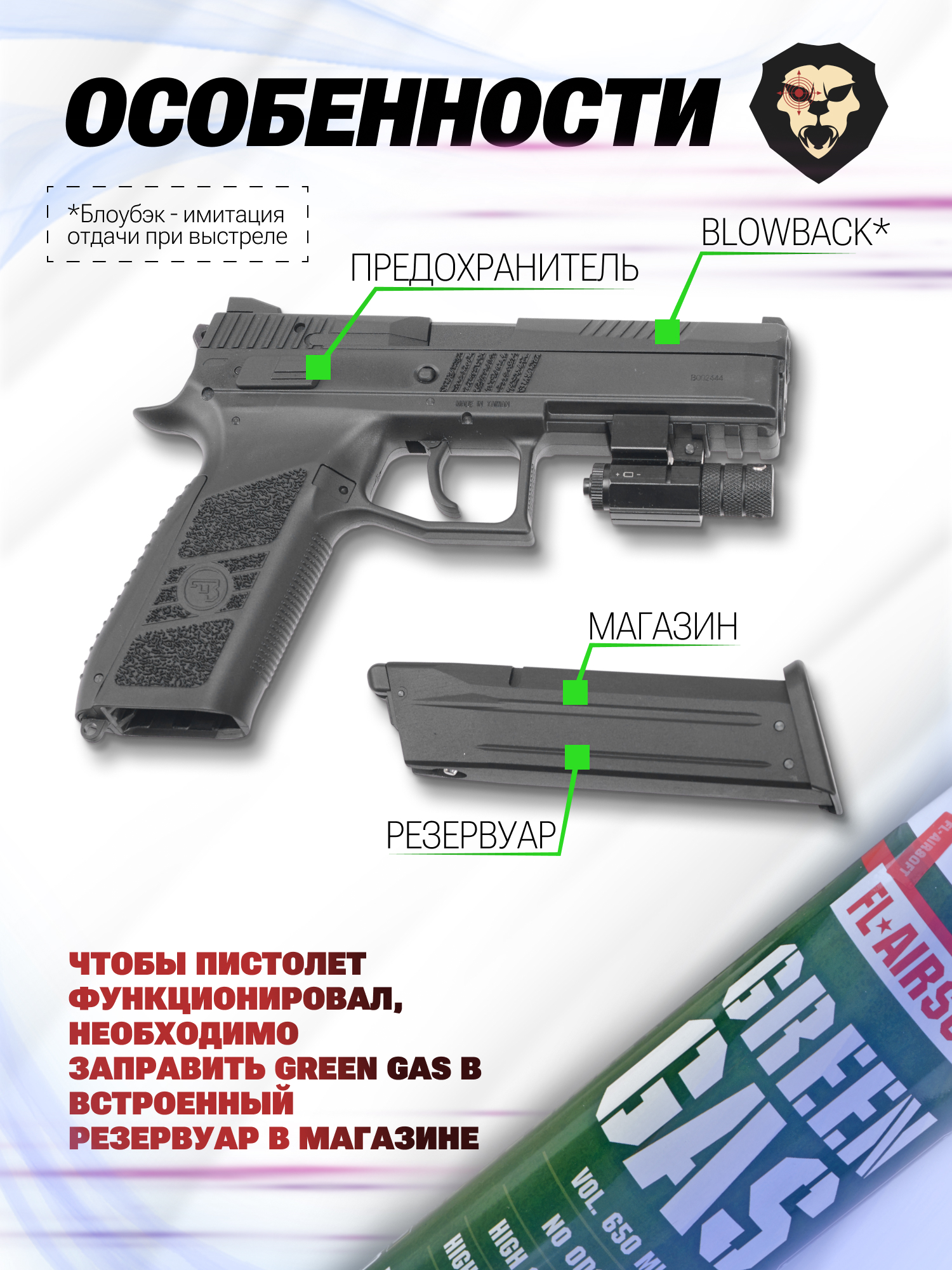 Магазин пистолета также выполняет функцию резервуара, который заполняется специальной газовой смесью, необходимой для совершения выстрела. Внутрь закачивается Green Gas через заправочное отверстие с клапаном на пятке накопителя.