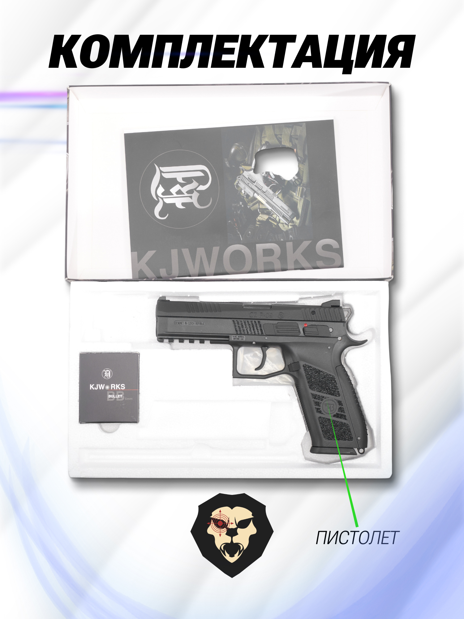 В зависимости от собственных предпочтений и правил страйкбольной игры, участники военно-тактических мероприятий могут использовать различную эирсофт пневматику, которая в деталях воспроизводит внешний вид реального боевого оружия. Кроме автоматов и винтовок, также применяются компактные образцы вроде пистолетов. Изготовлением последних занимается компания KJ Works, которая представила модель на базе чешского CZ P-09.