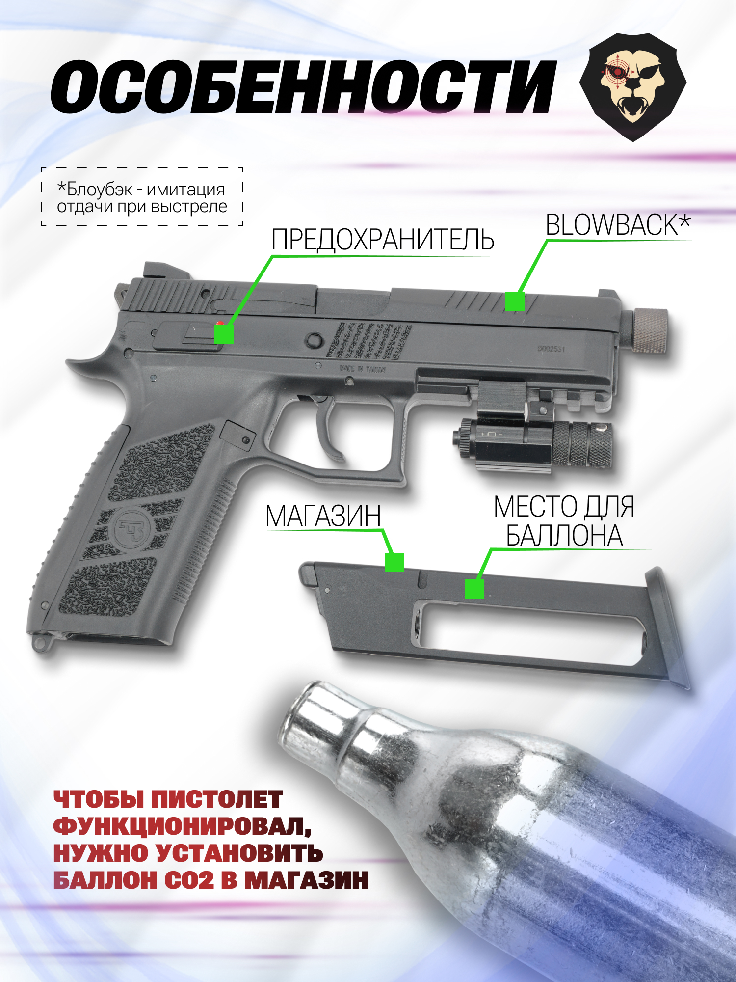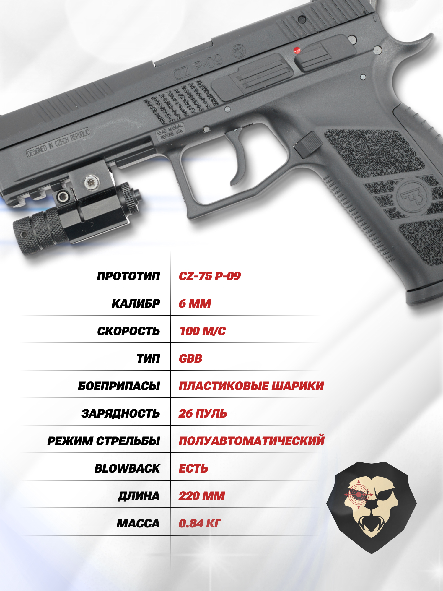 Рассматриваемый экземпляр воссоздает внешний вид и массогабаритные характеристики CZ P-09 чешского производства. В свою очередь боевой прототип является современной модификацией знаменитого пистолета CZ-75. Инженеры снабдили оружие эргономичной рукояткой со сменной тыльной накладкой, а также планкой Вивер под тактический обвес - все эти элементы успешно воспроизводит страйкбольная версия.