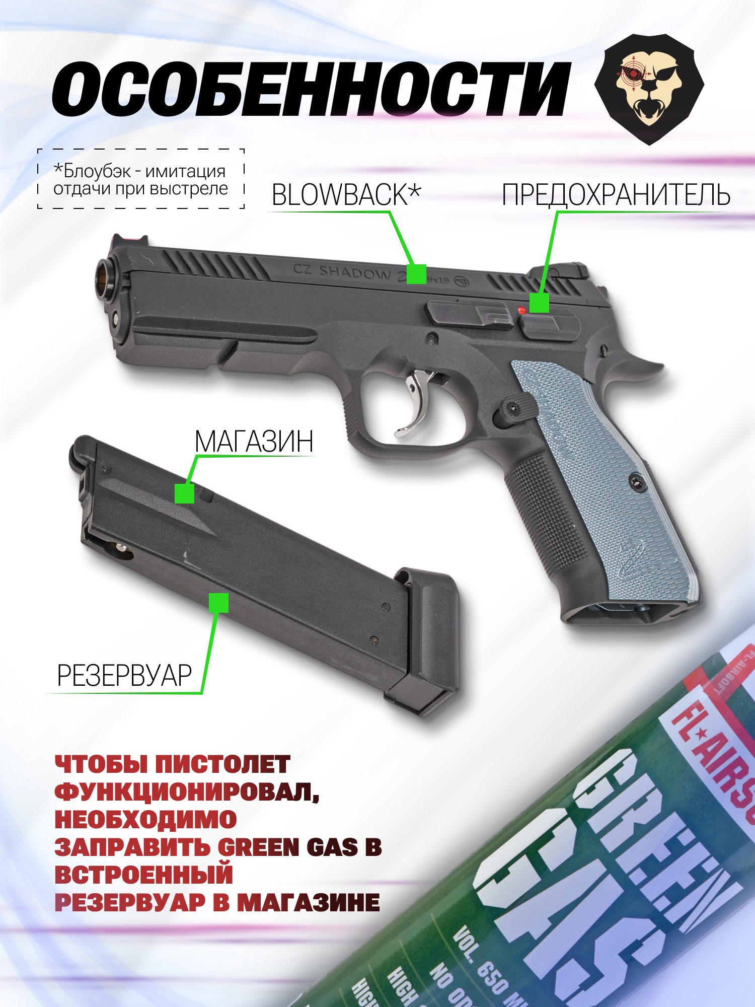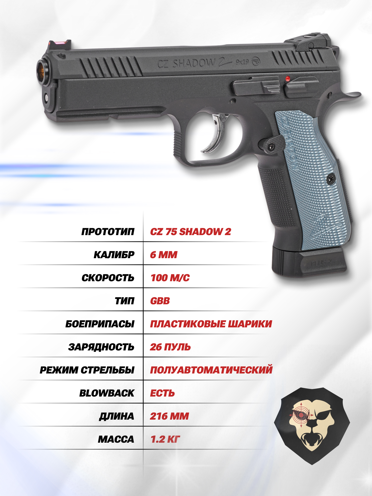 В рассматриваемом исполнении страйкбольной пневматики предприятие решило воссоздать дизайн полноразмерного пистолета CZ 75 Shadow 2. Экземпляры ЧЗ разрабатываются в Чехословакии и получили распространение по миру - в Чехии же они применяются в качестве табельного оружия полицейских, а на вооружении в армии стоит 82 серия. Представленная выше линейка выступает спортивной моделью, которую разработали в 2016-2017 г - за пройденное время этот образец укрепил свои позиции и пришелся по нраву критикам за счет технических решений.