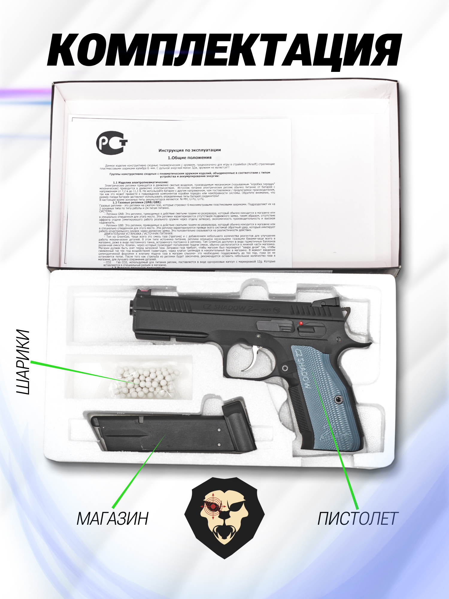 | Комплектация | Пистолет, магазин, шары, упаковка, краткая документация, копия сертификата (по запросу покупателя) |