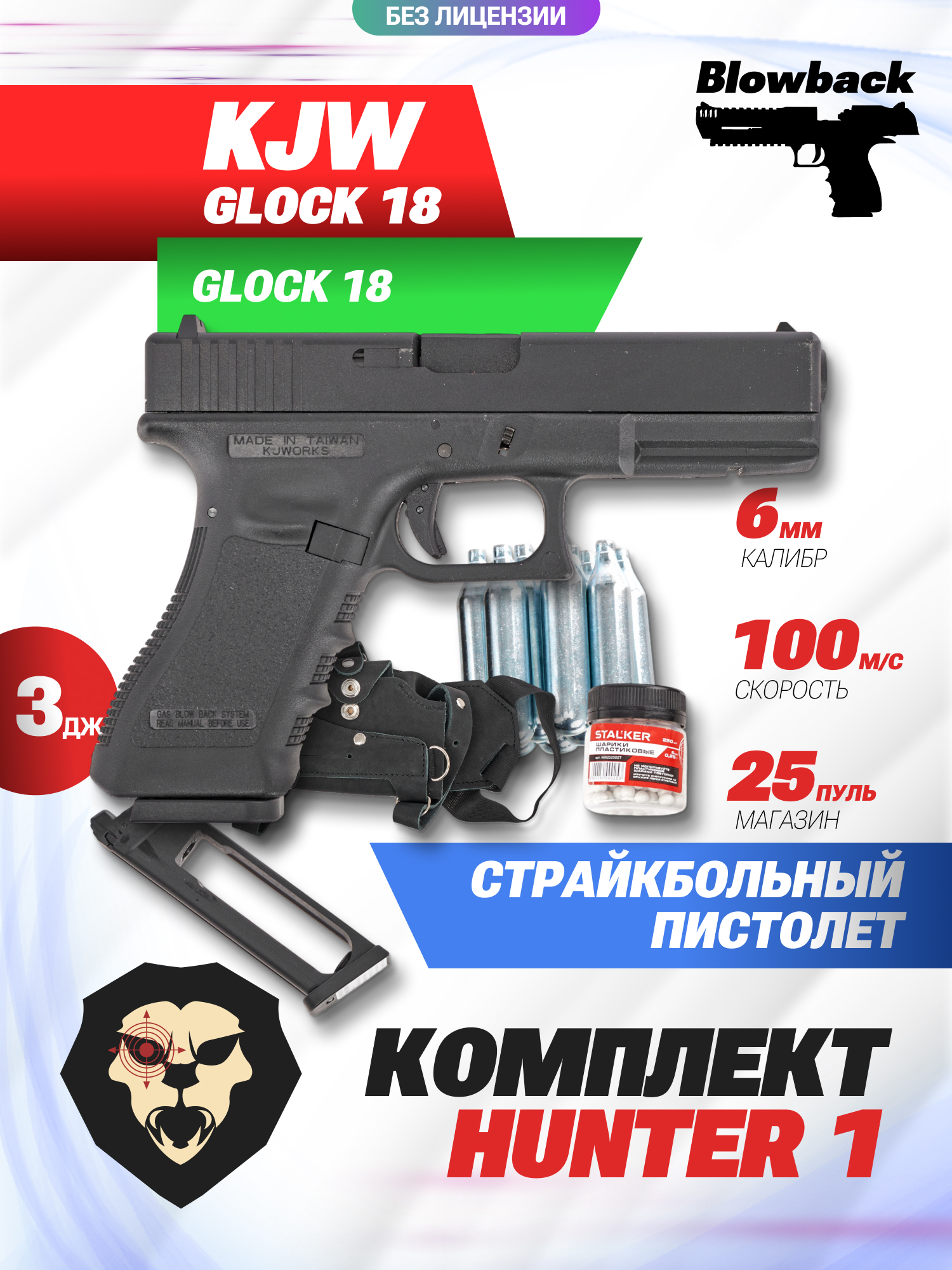 Страйкбольный пистолет KJW Glock 18 комплект Hunter №1 подарочный (Глок, 10 баллончиков, магазин, оперативная кобура, 250 шаров) купить в интернет-магазине Popadiv10.