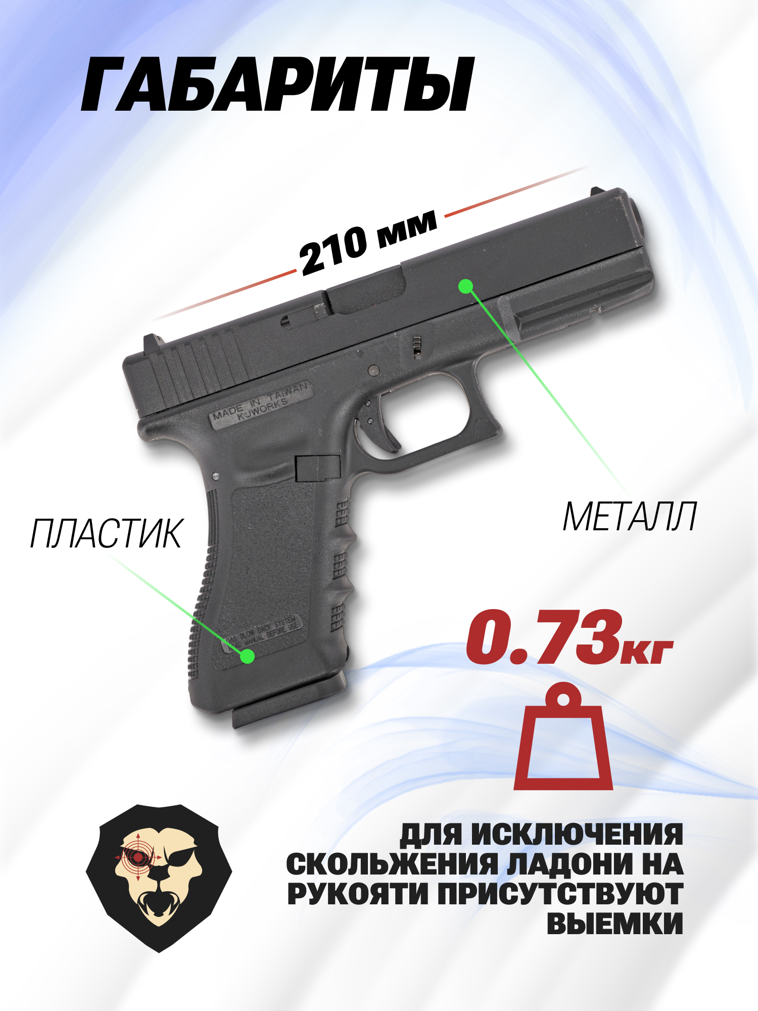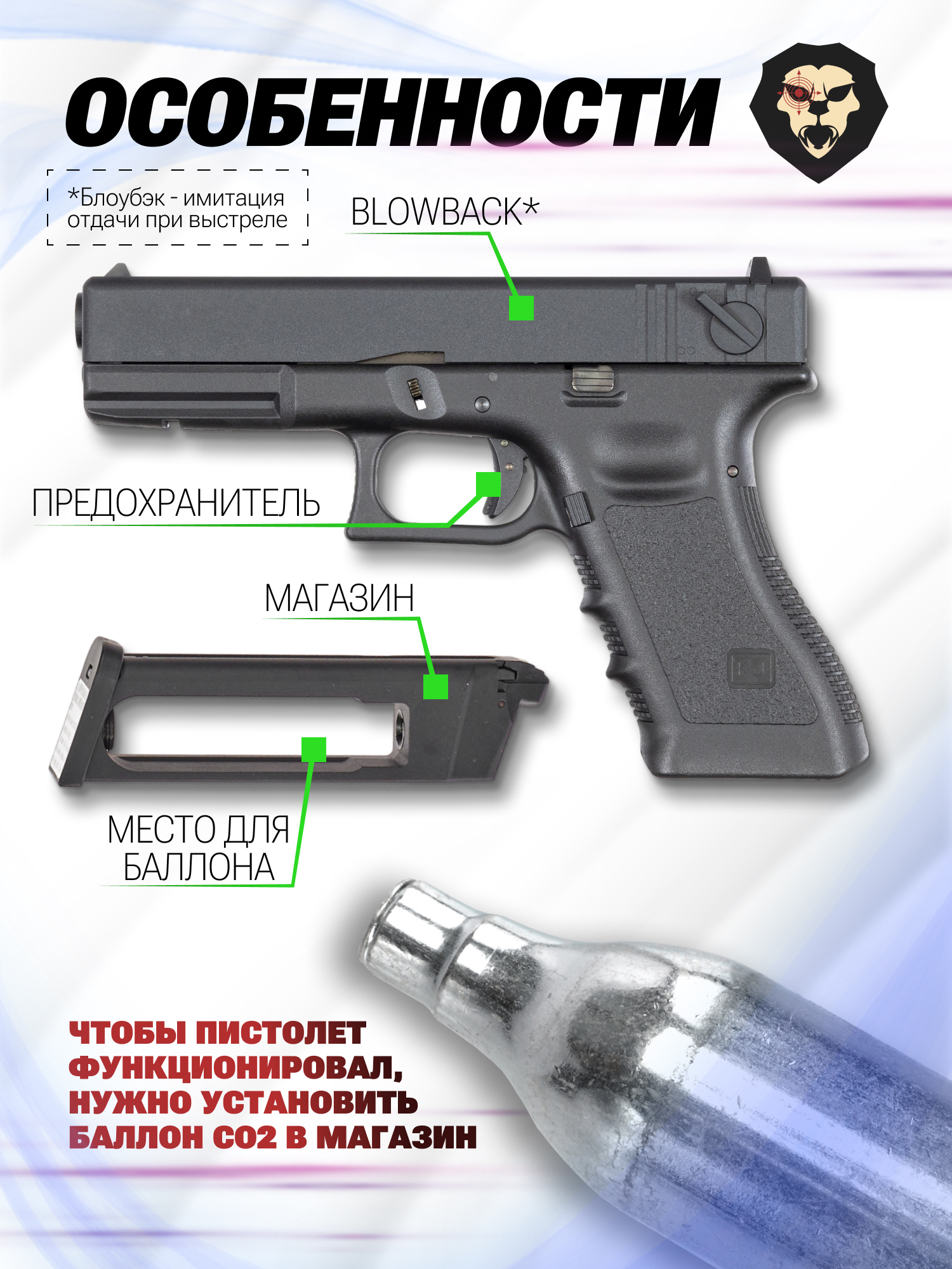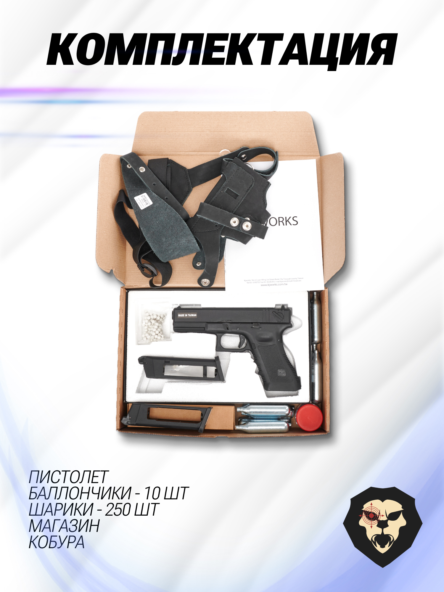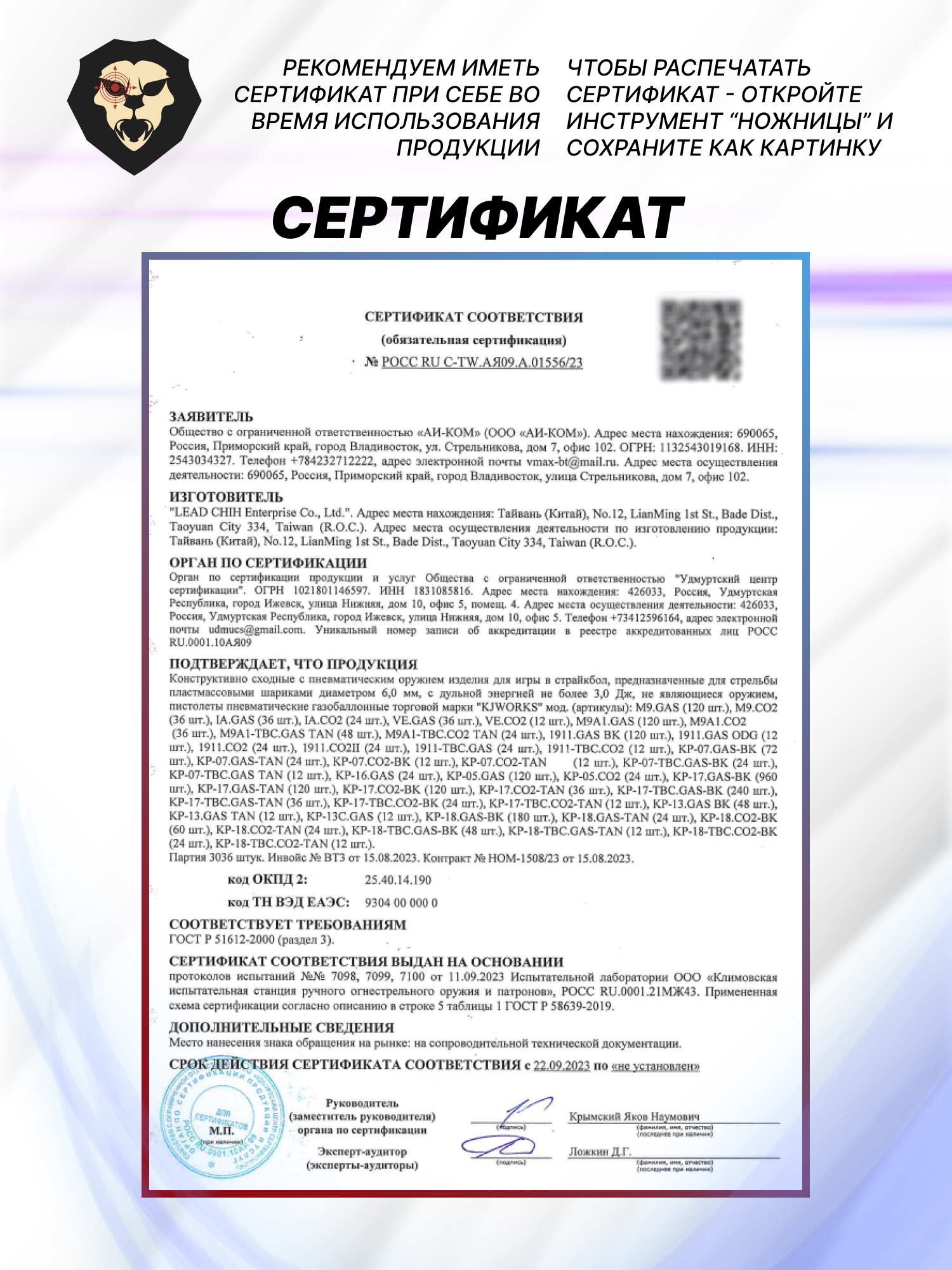 | Комплектация | Пистолет, магазин, шары, доп магазин, 10 баллонов, кобура, 250 шаров, упаковка, краткая документация, копия сертификата (по запросу покупателя) |