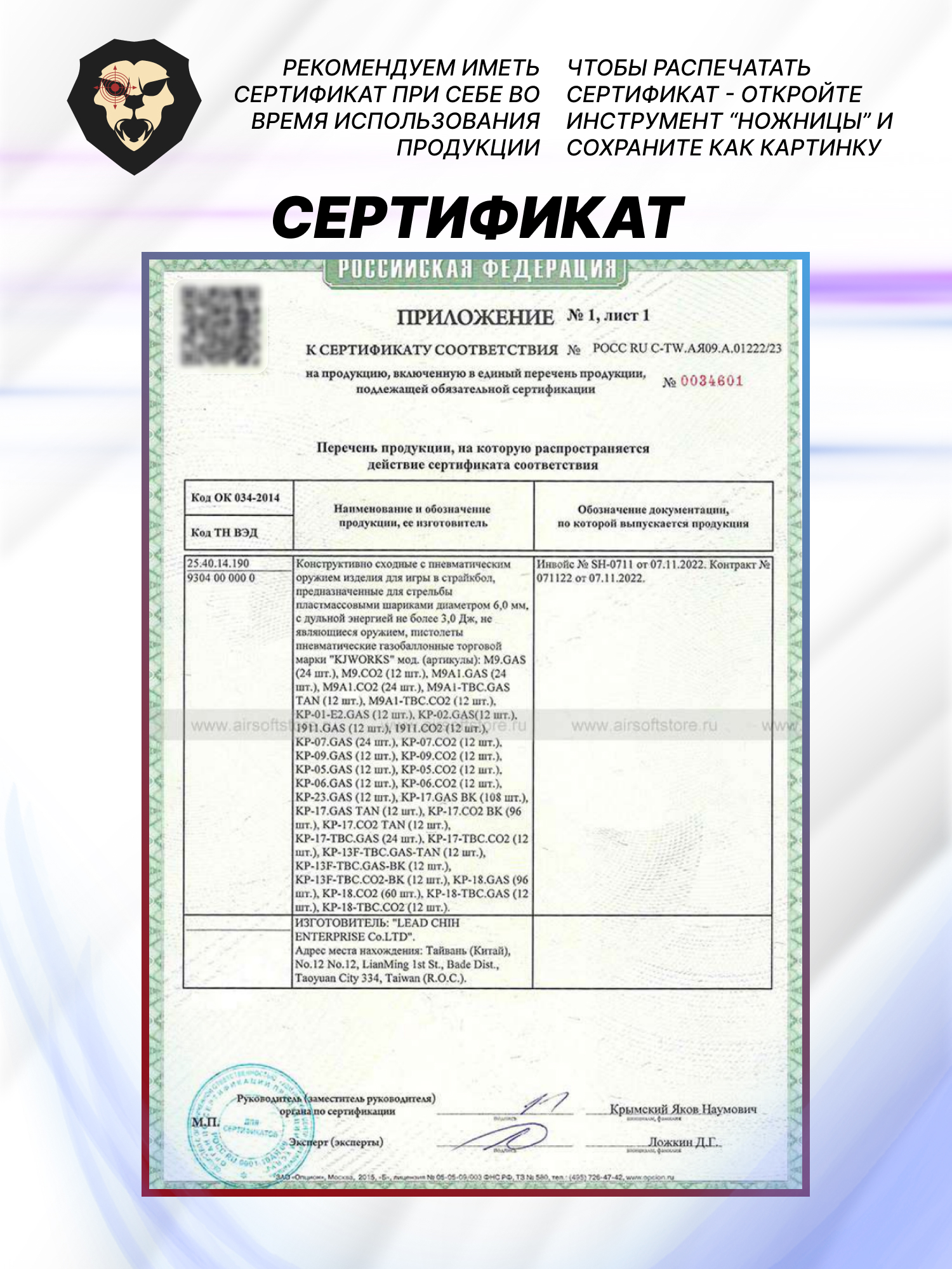 | Комплектация | Пистолет, магазин, ключ, упаковка, краткая документация, копия сертификата (по запросу покупателя) |