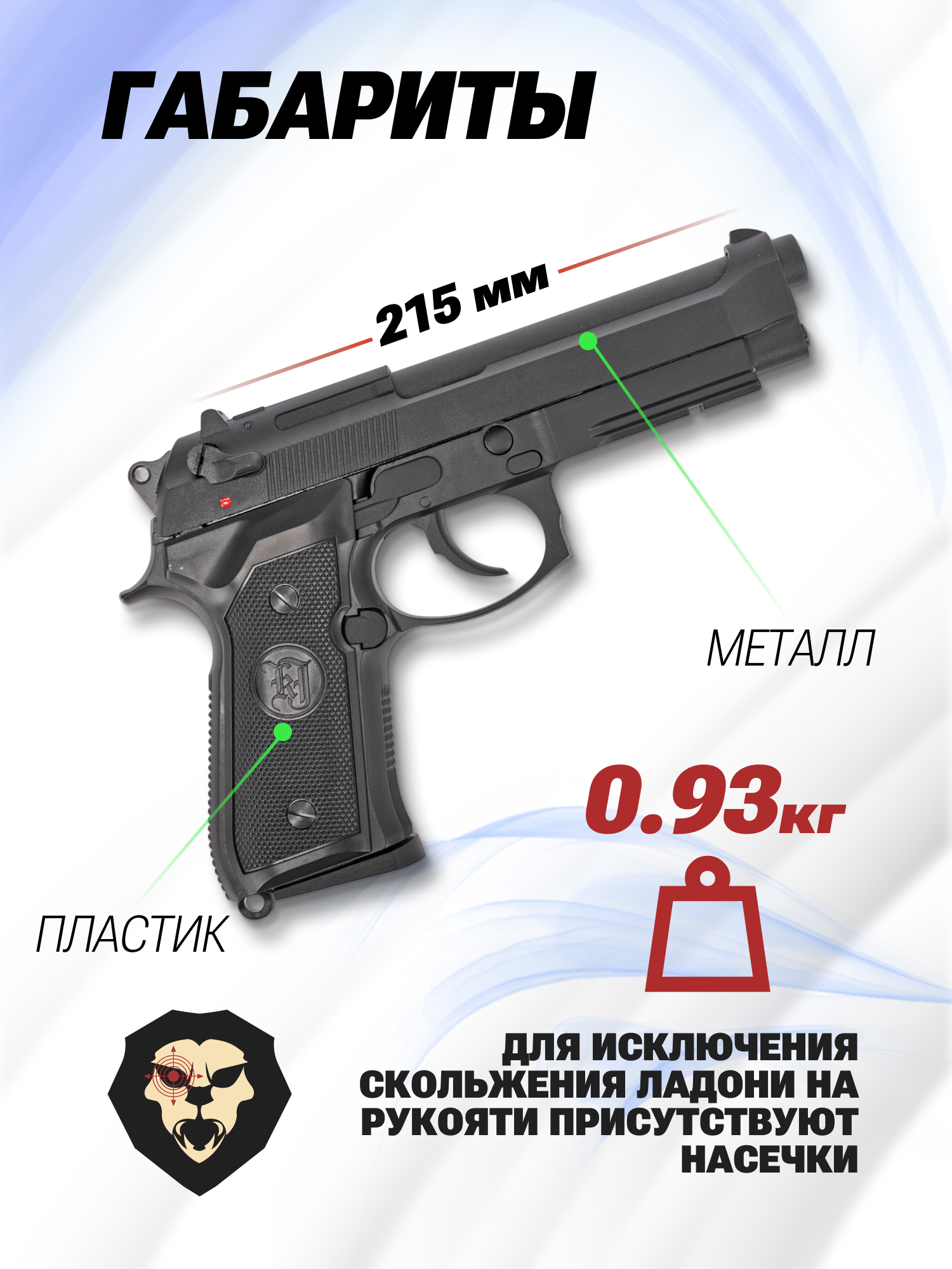 Улучшению также подверглась рукоять, которая дополняется рельефными насечками на фронтальной и тыльной части, что способствует удобству удержания, предотвращая соскальзывание ладони. Размер эйрсофт версии пистолета составляет 215 мм, аналогично параметрам боевого прототипа, а из-за применения облегченного сплава масса изделия снизилась до 930 грамм.