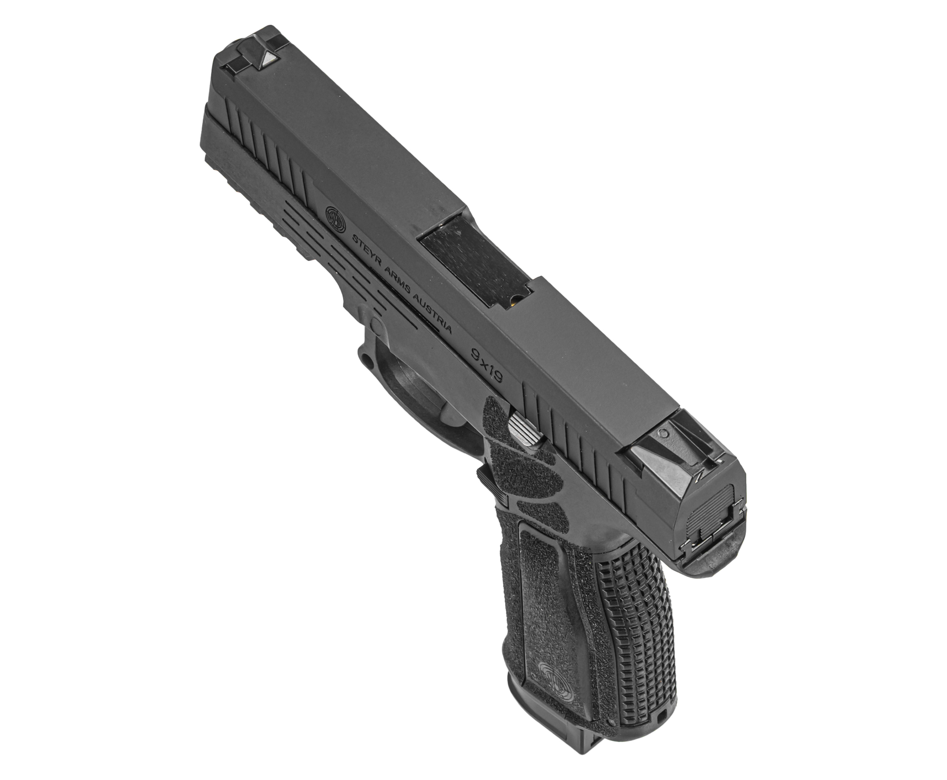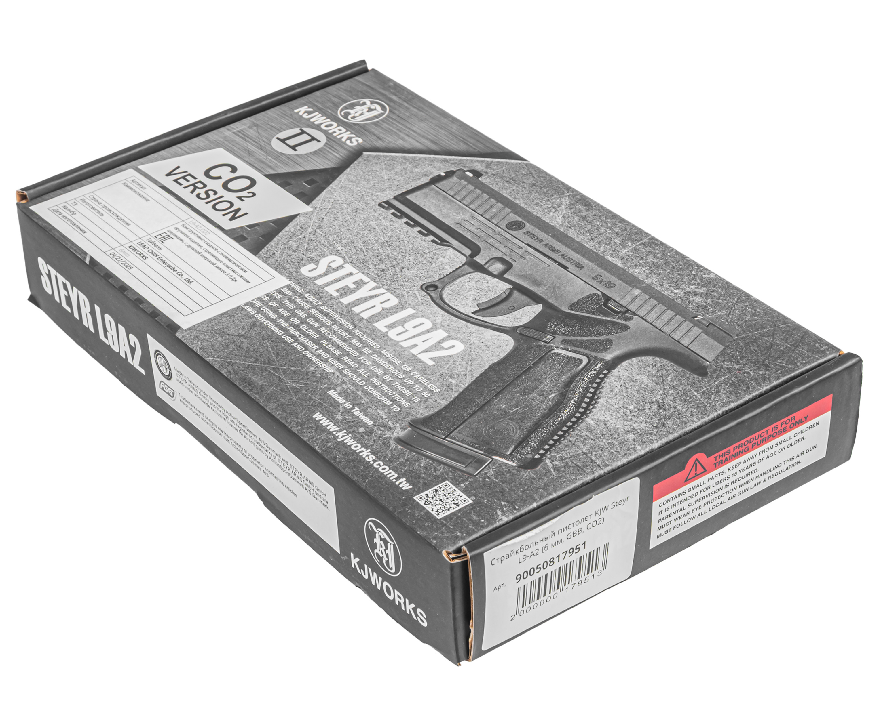 Пистолет KJW CO2 Steyr L9-A2 обладает контактным предохранителем в виде гребня на спусковом крючке, как у Глока. Кроме стандартных открытых приспособлений в виде мушки и целика для наведения можно использовать блок ЛЦУ, который подвешивается на планку Weaver рамы. Последняя изготавливается из полимера, тогда как слайд выполнен из металла.