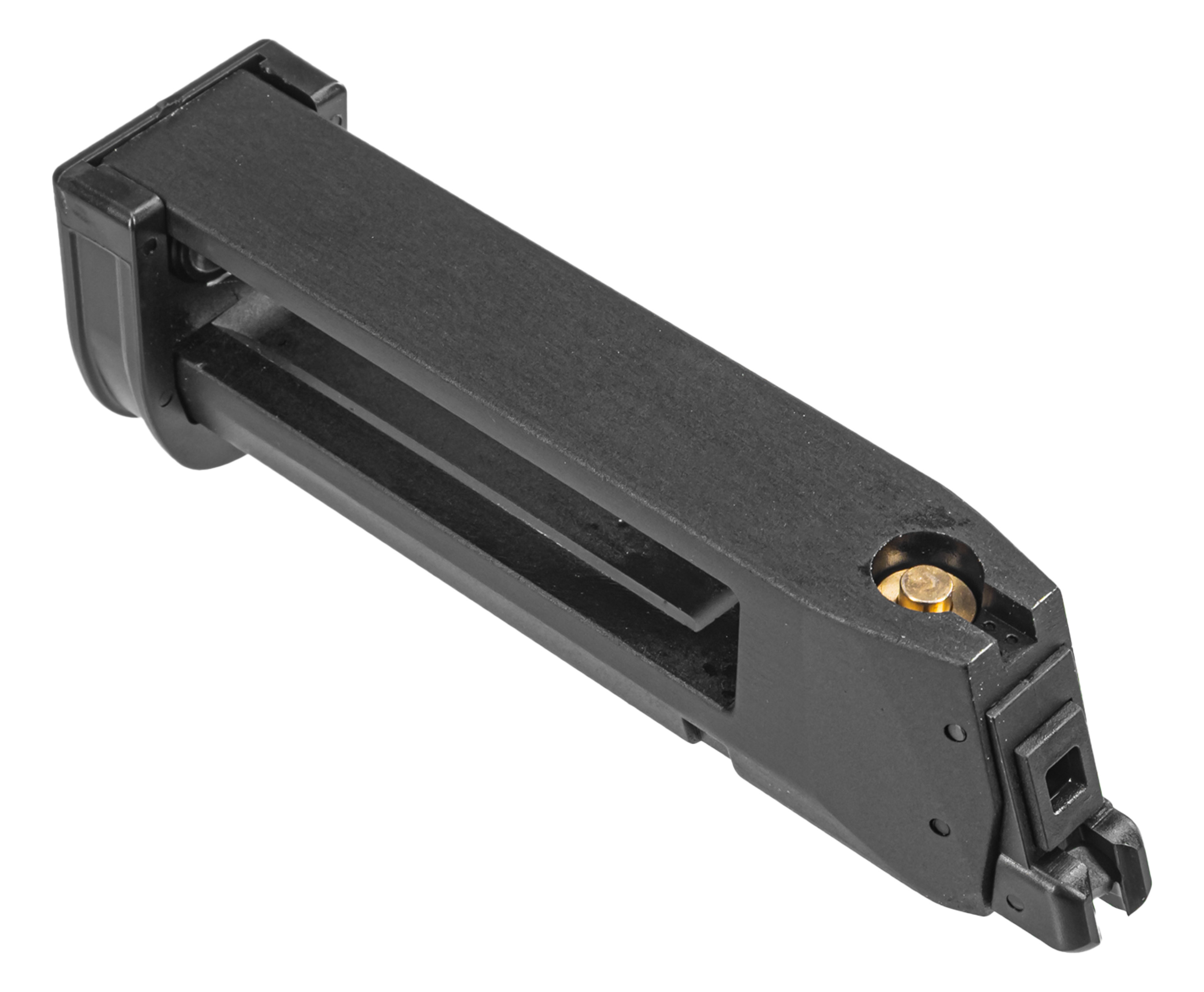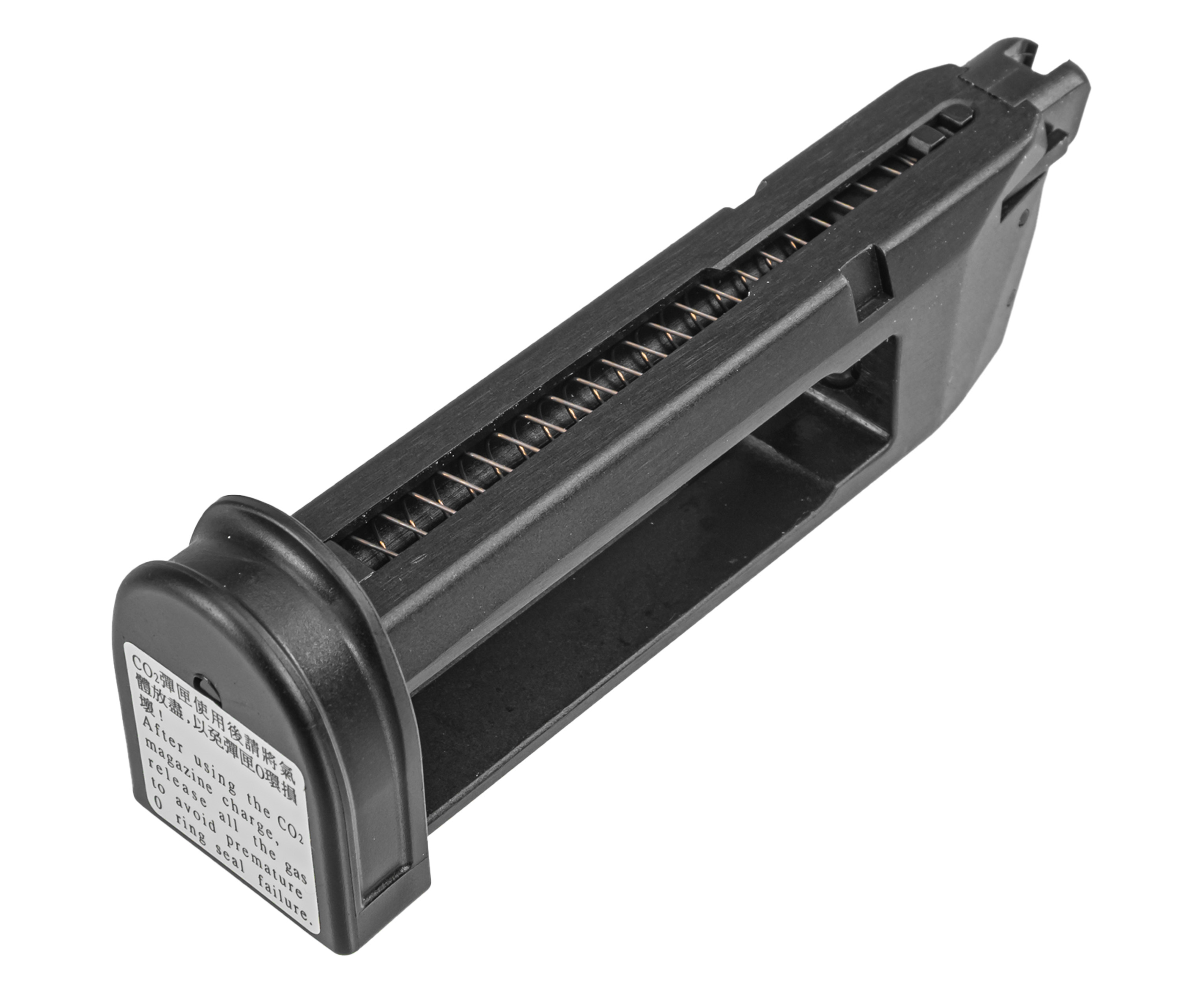 Магазин отмыкается нажатием на кнопку возле скобы. Кроме прочего в накопителе предусмотрен отсек, в который устанавливается газовый баллон 12 грамм CO2, необходимый для функционирования пневматики. После размещения одноразового хранилища его требуется затянуть поджимным винтом до прокола носовой части.