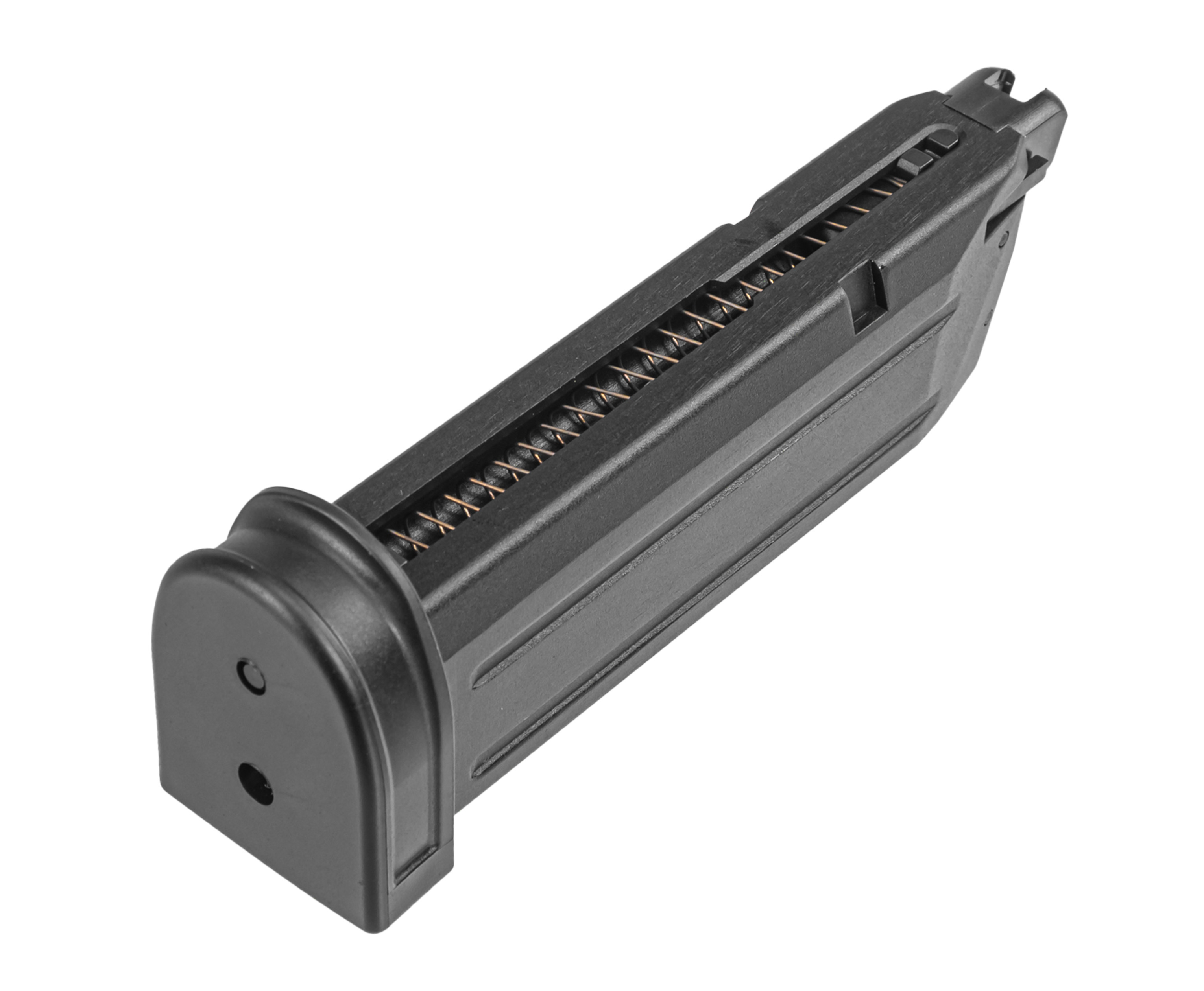Сам накопитель также гарантирует бесперебойное боепитание и рассчитан на заряжание 24 сферических пластиковых пуль. Для удобства перезаполнения магазина шарами рекомендуется воспользоваться лоадером. Метаемые снаряды калибром 6 мм подаются в приемник оружия посредством подпружиненного бегунка.