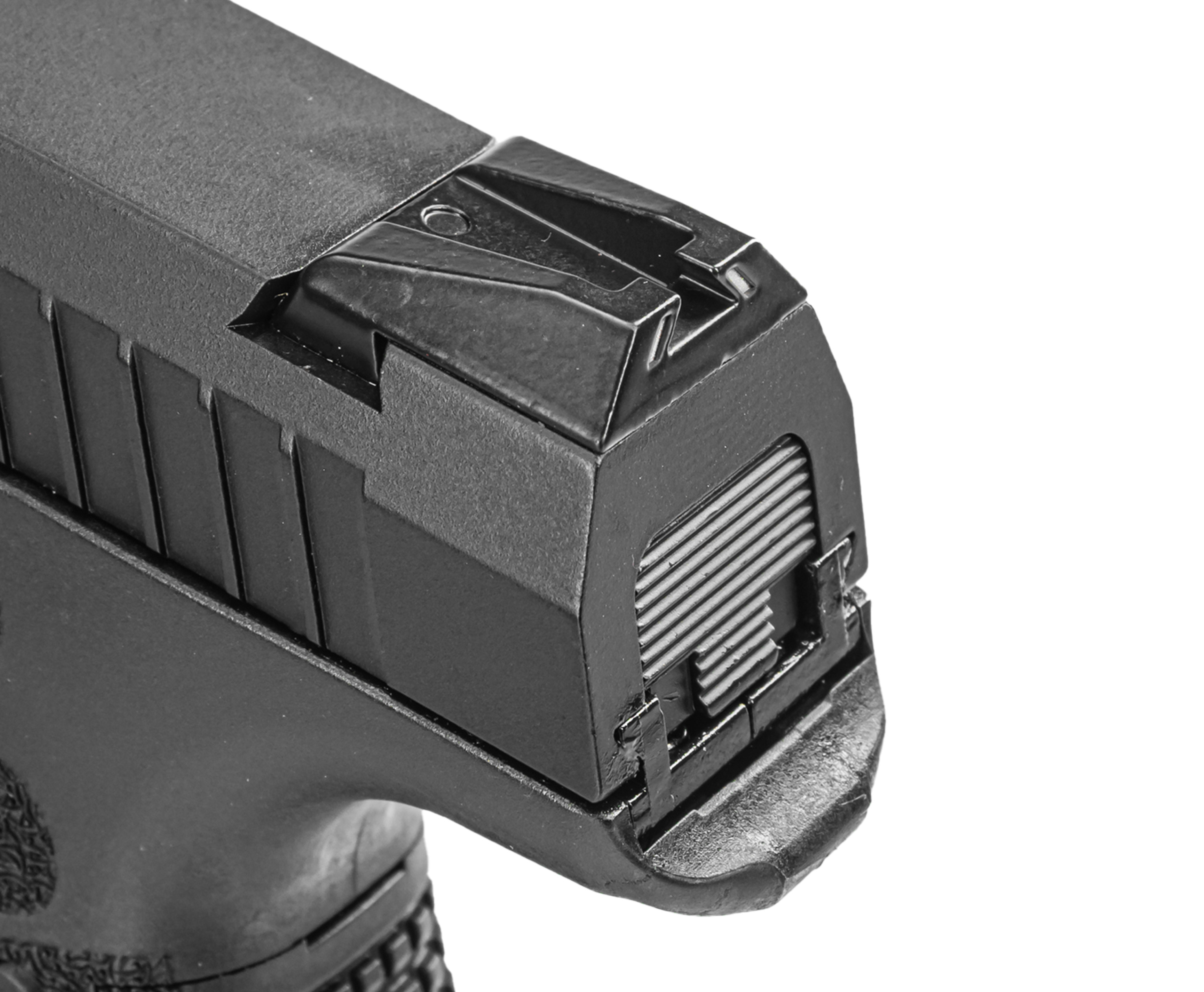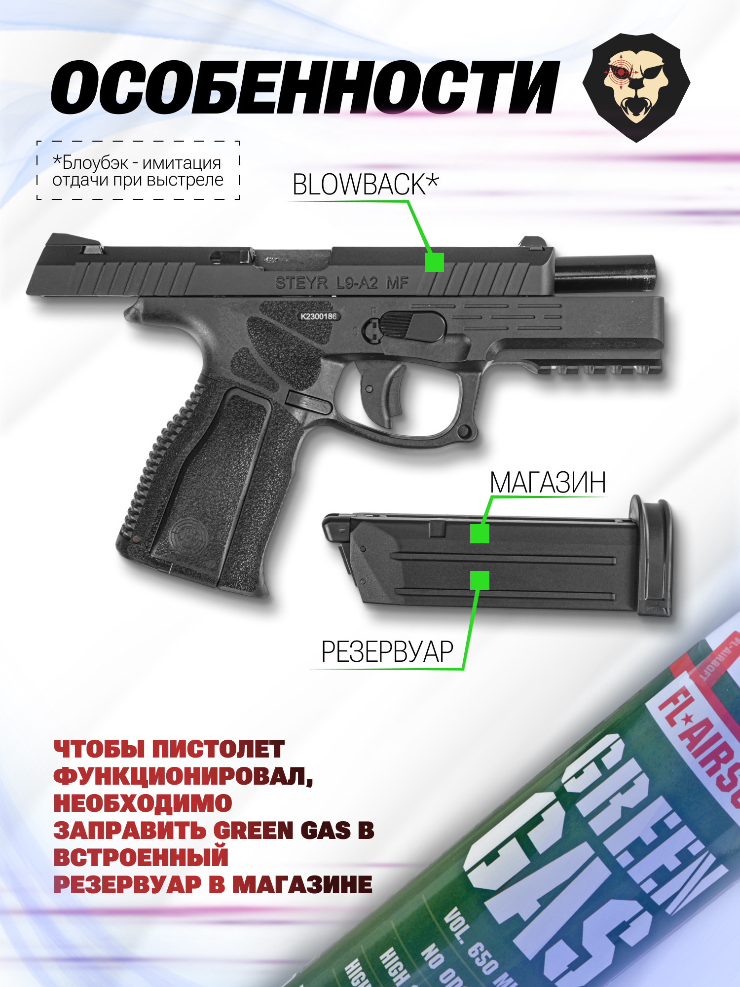 В свою очередь слайд выполнен из металла. Кожух-затвор полностью подвижен и при стрельбе смещается назад, имитируя эффект отдачи, как у боевого оружия. Такое свойство страйкбольный Штеер приобрел благодаря механизму Blowback, на работу которого перенаправляется часть газа, затраченного на выстрел.