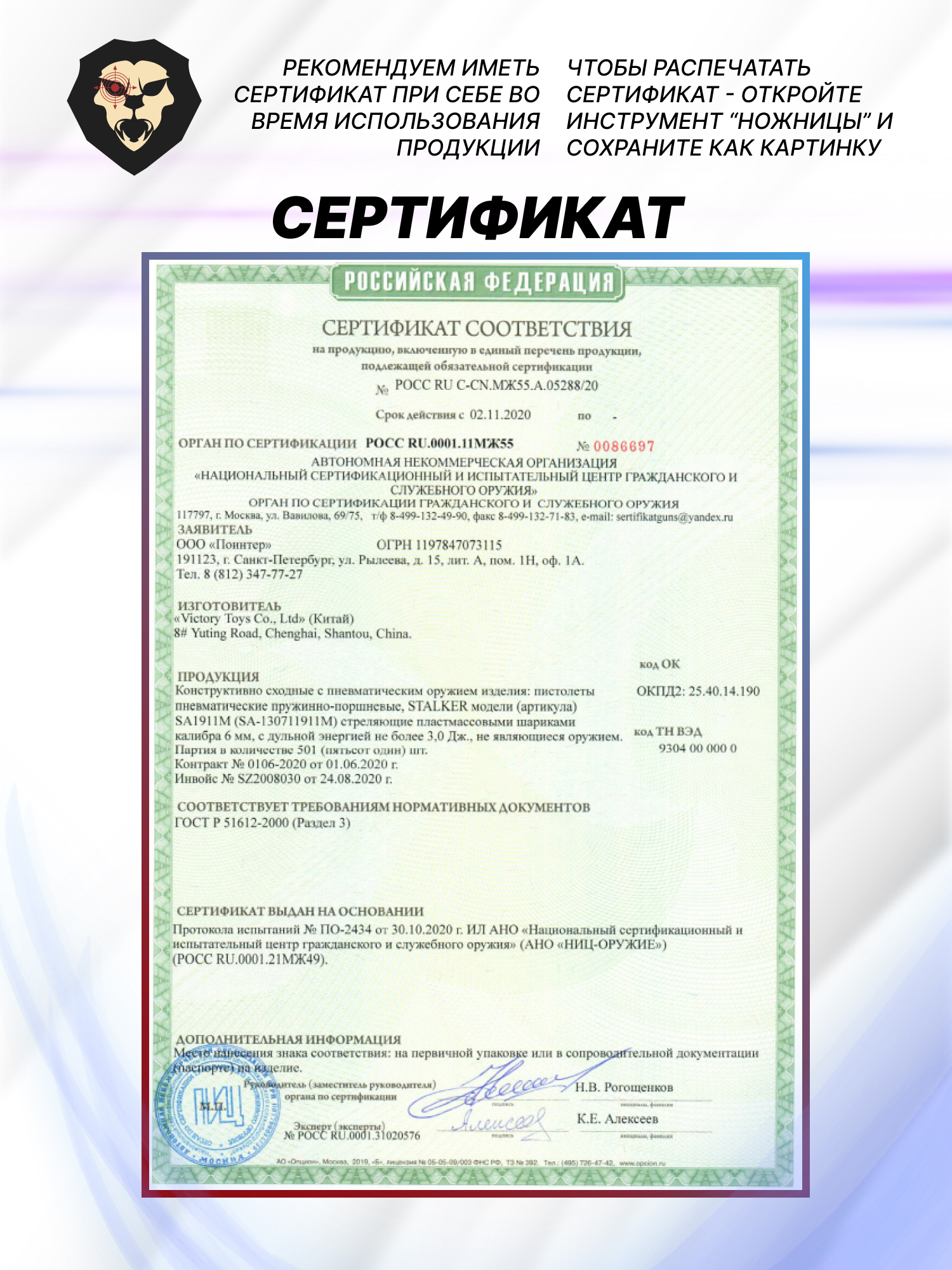 | Комплектация | Пистолет, магазин, упаковка, краткая документация, копия сертификата (по запросу покупателя) |