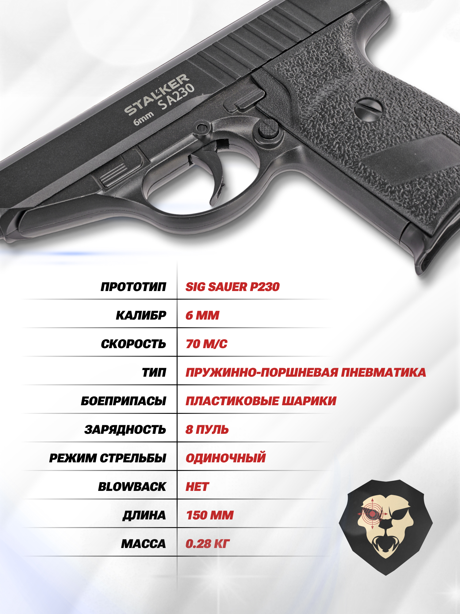 Компания Сталкер разрабатывает всевозможную пневматику, в том числе и «мягкую» - ассортимент насыщен как самозарядными изделиями, так и спринговыми экземплярами. К перечню последних принадлежит обозреваемый пистолет SA230 - боевым прототипом для выполнения конструкции выступил Sig Sauer P230, изготовленный одноименной германско-швейцарской фирмой в 1968-1970 гг. Конкретная модель огнестрельного оружия предназначалась полицейским для скрытого ношения, что обуславливается компактными размерами.