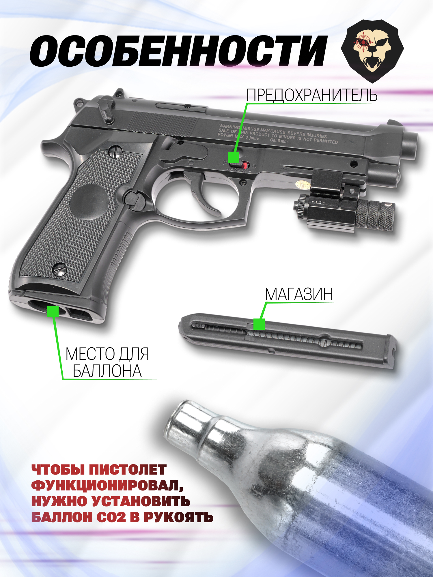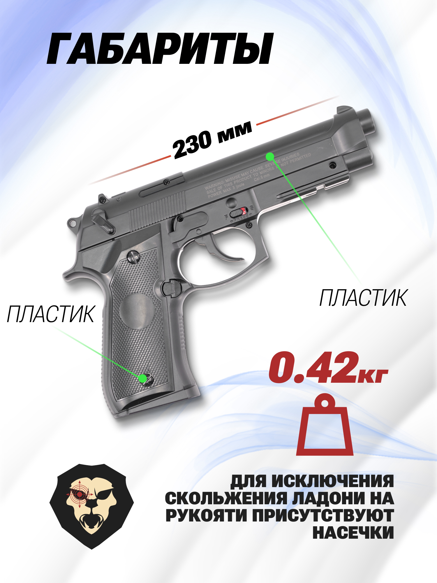Представленный образец является репликой итальянского пистолета Beretta M9, более 40-ти лет применяемого вооруженными силами и полицейскими подразделениями, а также в качестве оружия для самообороны и спорта во множестве мировых стран. Изделие такого типа отлично подойдет для формирования достоверного образа сотрудника полицейского спецназа США или военного из числа ВС стран НАТО.