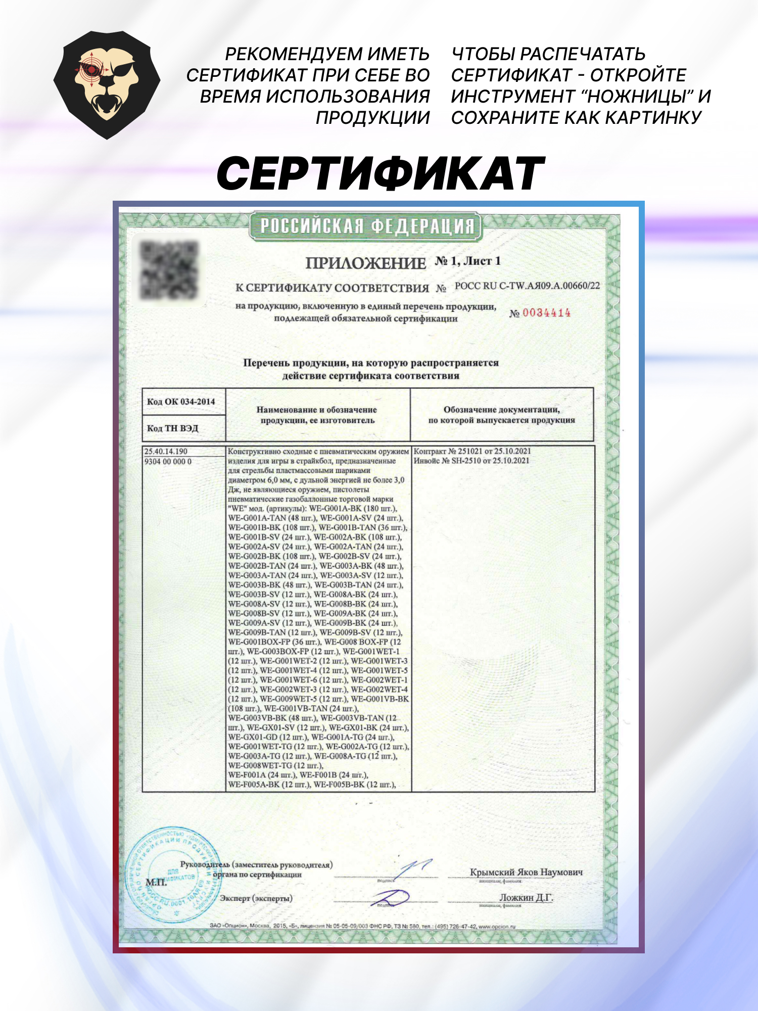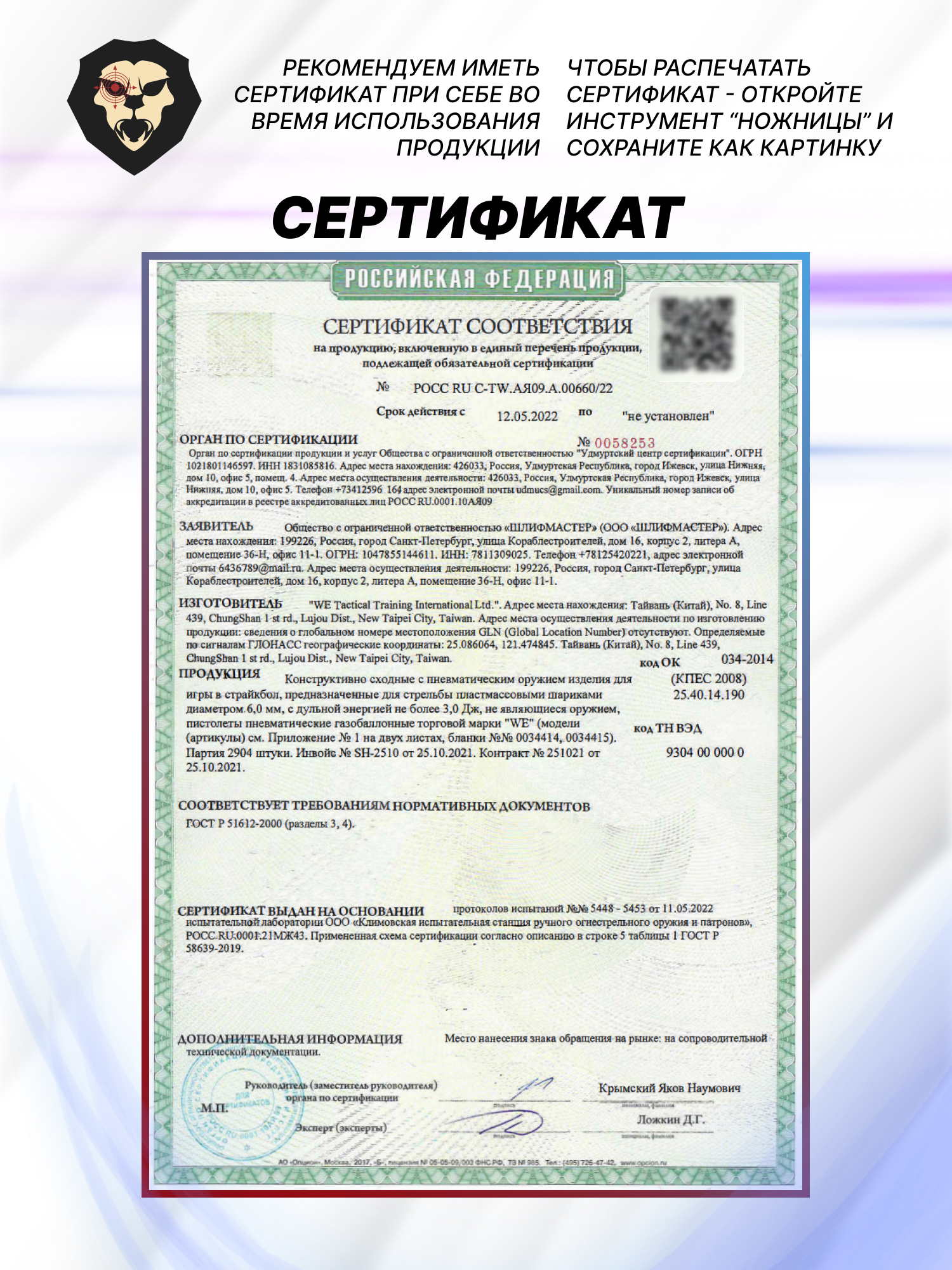 | Комплектация | Пистолет, магазин, упаковка, краткая документация, копия сертификата (по запросу покупателя) |