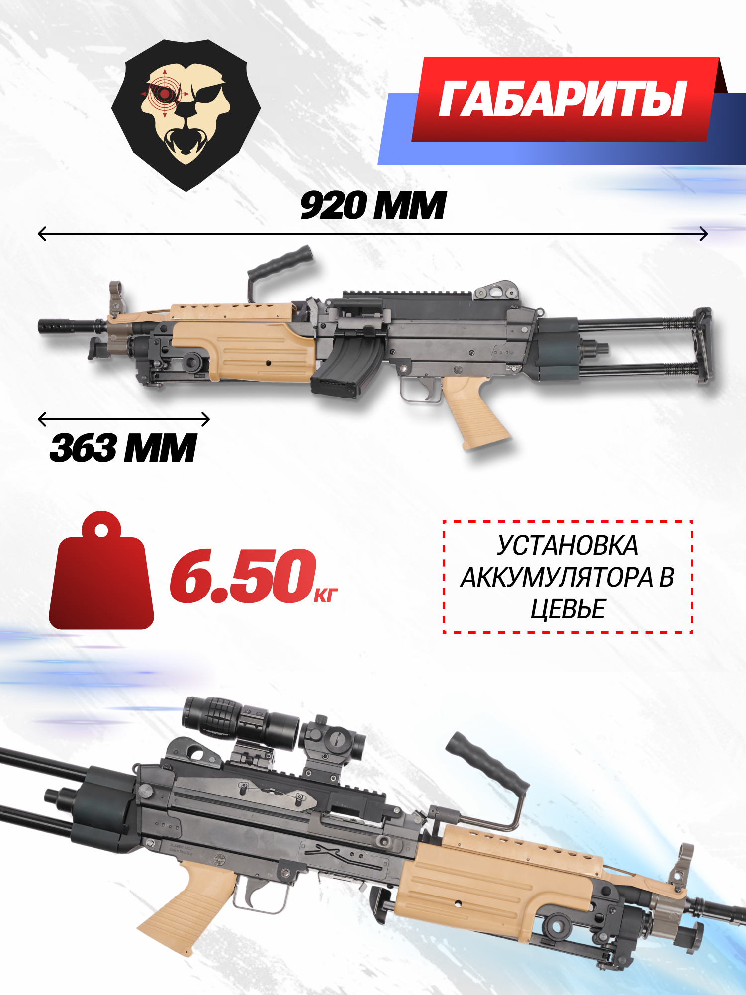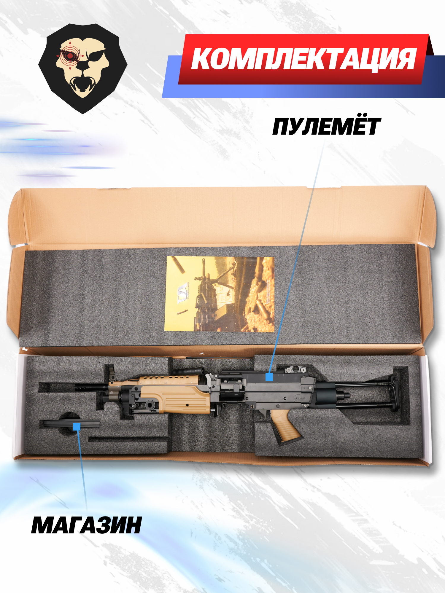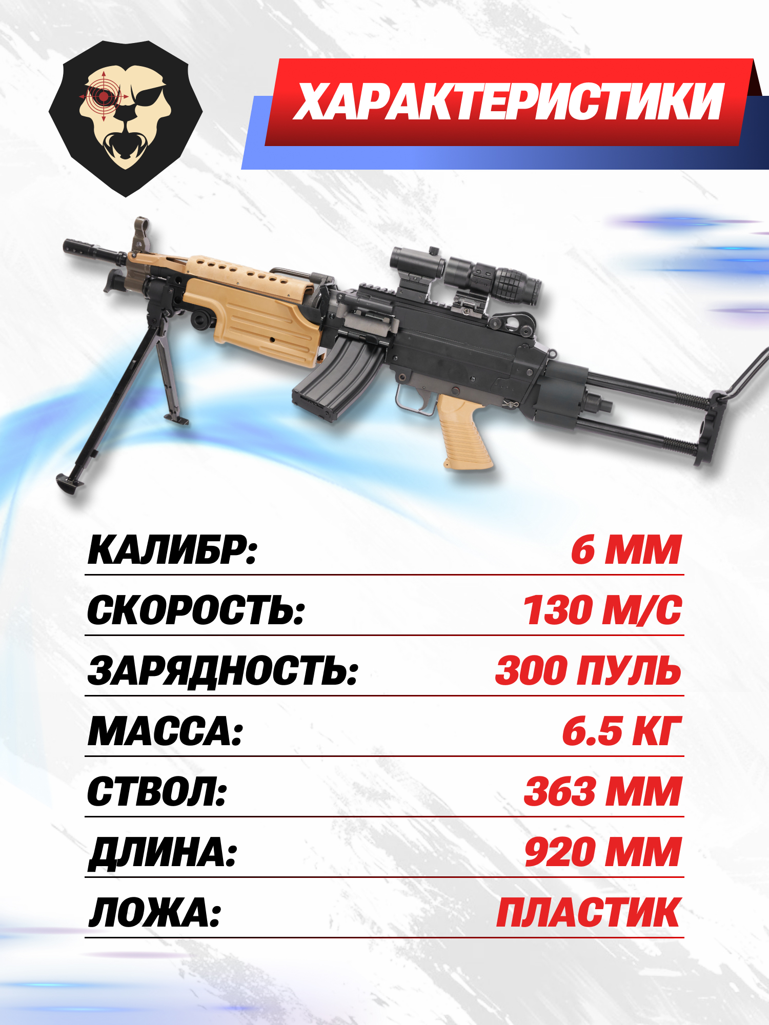 | Комплектация | Страйкбольный пулемет, магазин, сошки, упаковка, краткая документация |