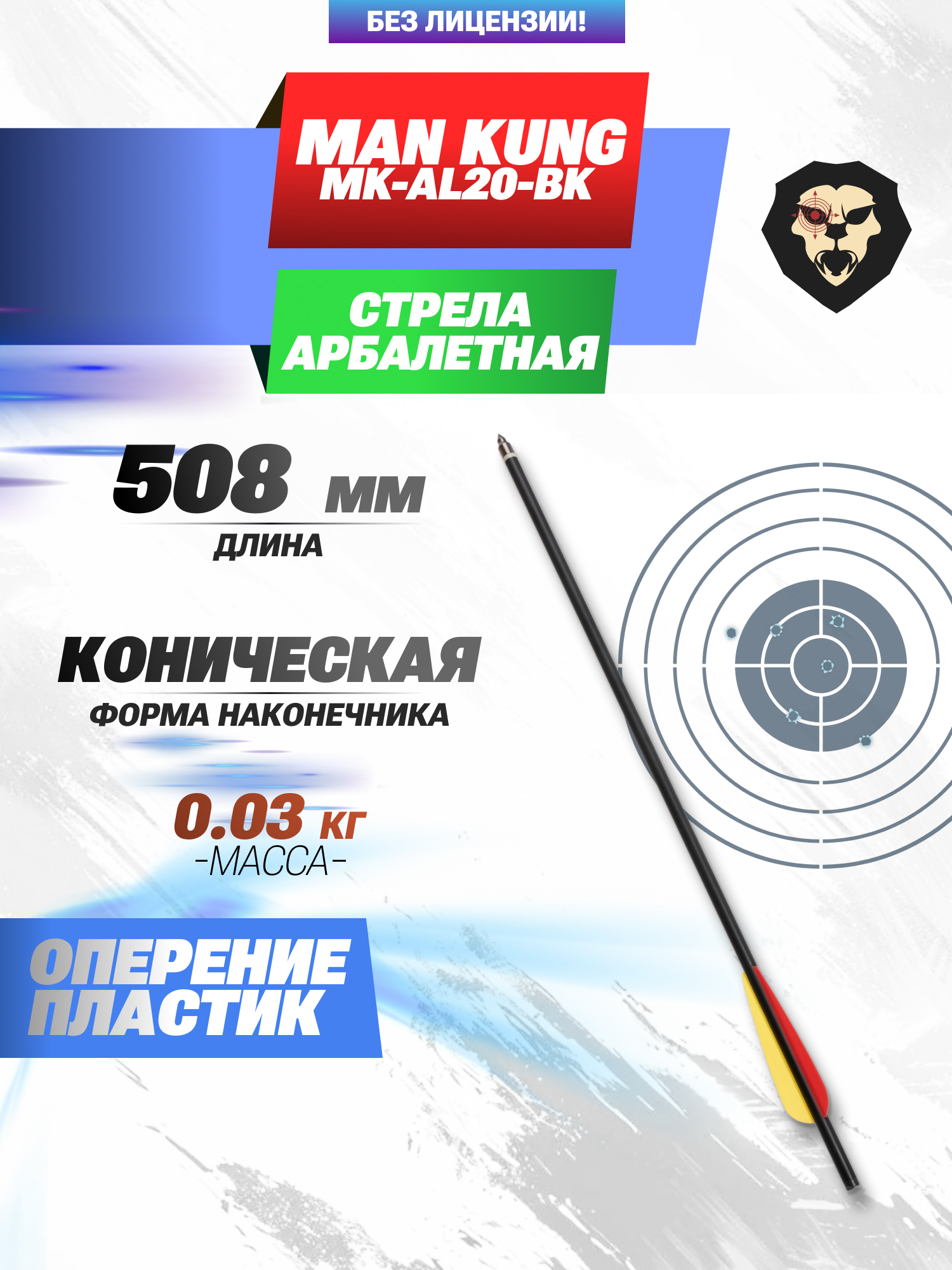 Рассматриваемый 31-граммовый образец подойдет для использования с блочными и рекурсивными арбалетами, имеющими длинную направляющую. Размер такого экземпляра принадлежит значению 508 миллиметров, 100 из которых занимает пластиковое оперение. Представленная арбалетная стрела Man Kung располагает алюминиевым стержнем и вкрученным стальным наконечником конического форм-фактора.