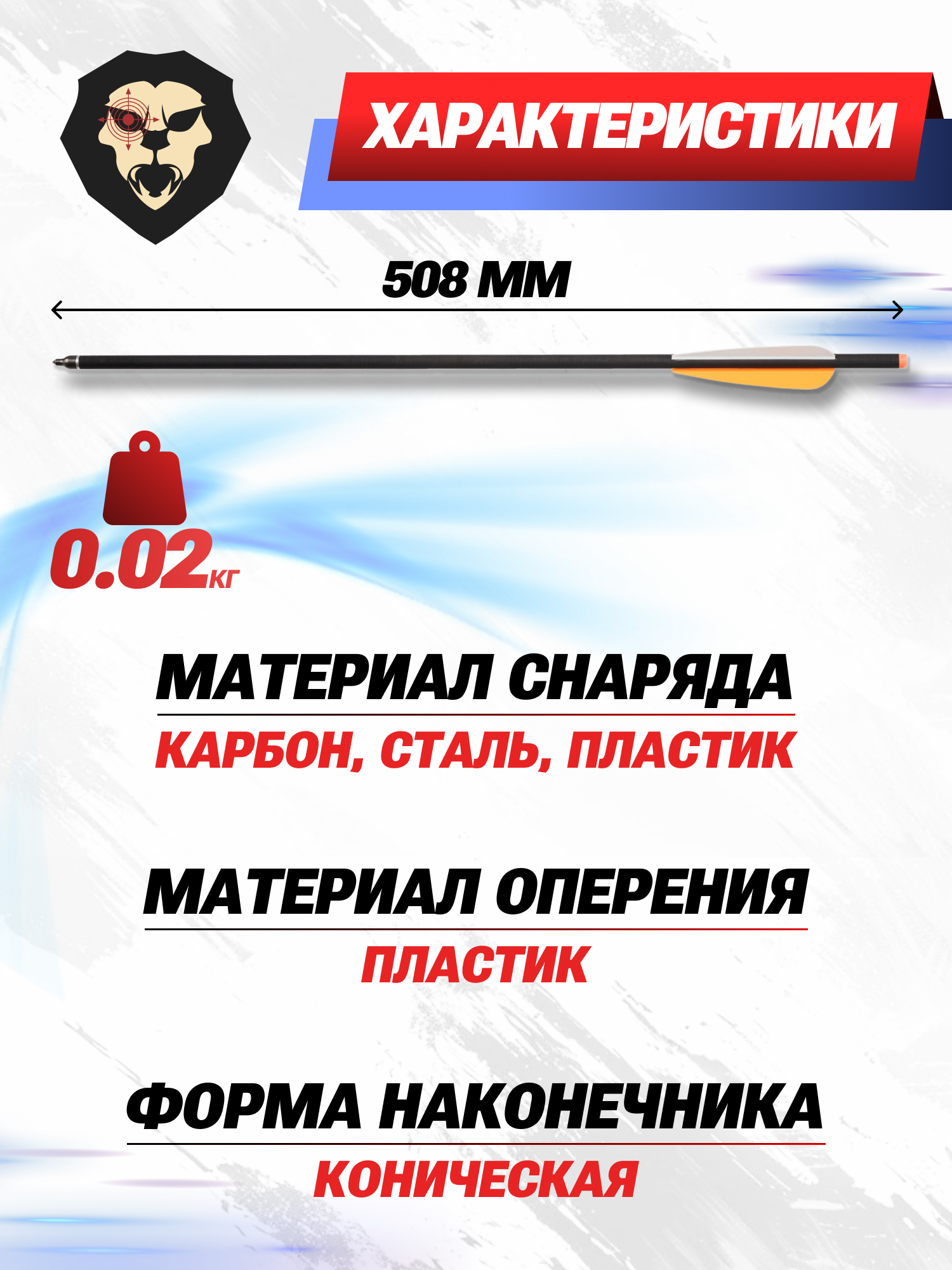 Рассматриваемые боеприпасы изготавливаются из сырья повышенного качества. Сама стрела выполняется из карбона, наконечник с коническим форм-фактором изготавливают из стали, а оперение делают из пластика. Представленные 508-миллиметровые снаряды отличаются весом в 27 грамм. Стоит заметить, что такие карбоновые стрелы обладают повышенными показателями прочности.