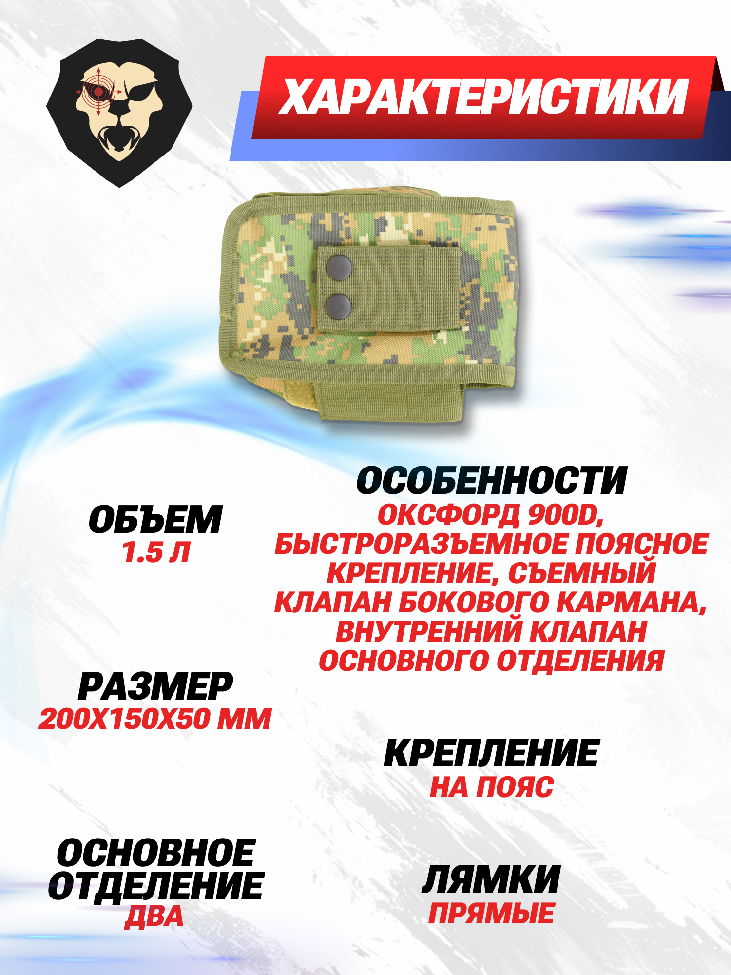 Подсумки под снаряжение представленной серии выполнили из нейлона марки Оксфорд с плотностью 900D. Благодаря этому вещь долговечна и надежна. Цветовое исполнение — цифровой камуфляж.