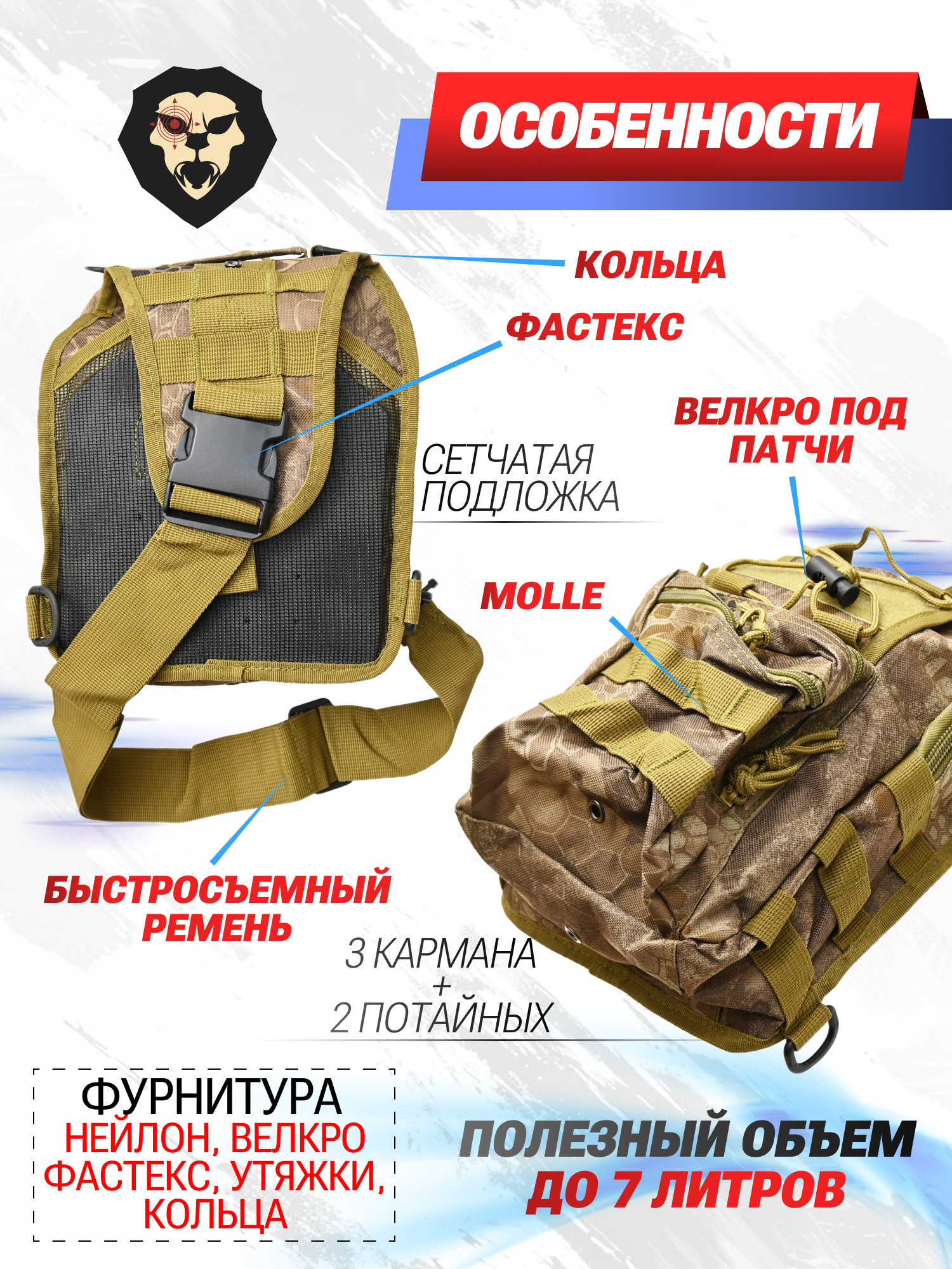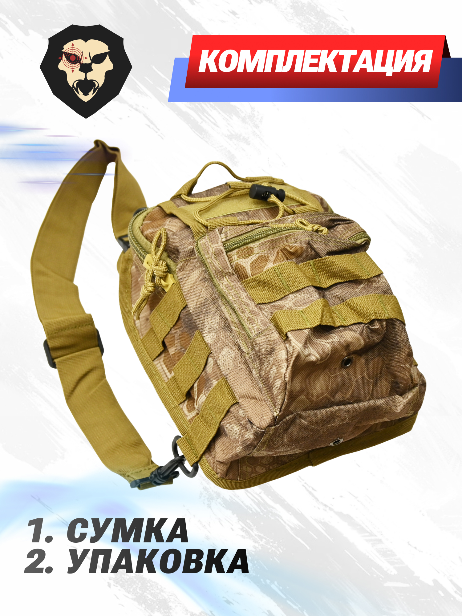 Военная сумка камуфляж включает два емких отделения, пару потайных карманов с тыльной стороны и фронтальный плоский отдел. Также на передней панели присутствует утяжка с системой внешнего крепления. По бокам и спереди прошит Молле интерфейс.