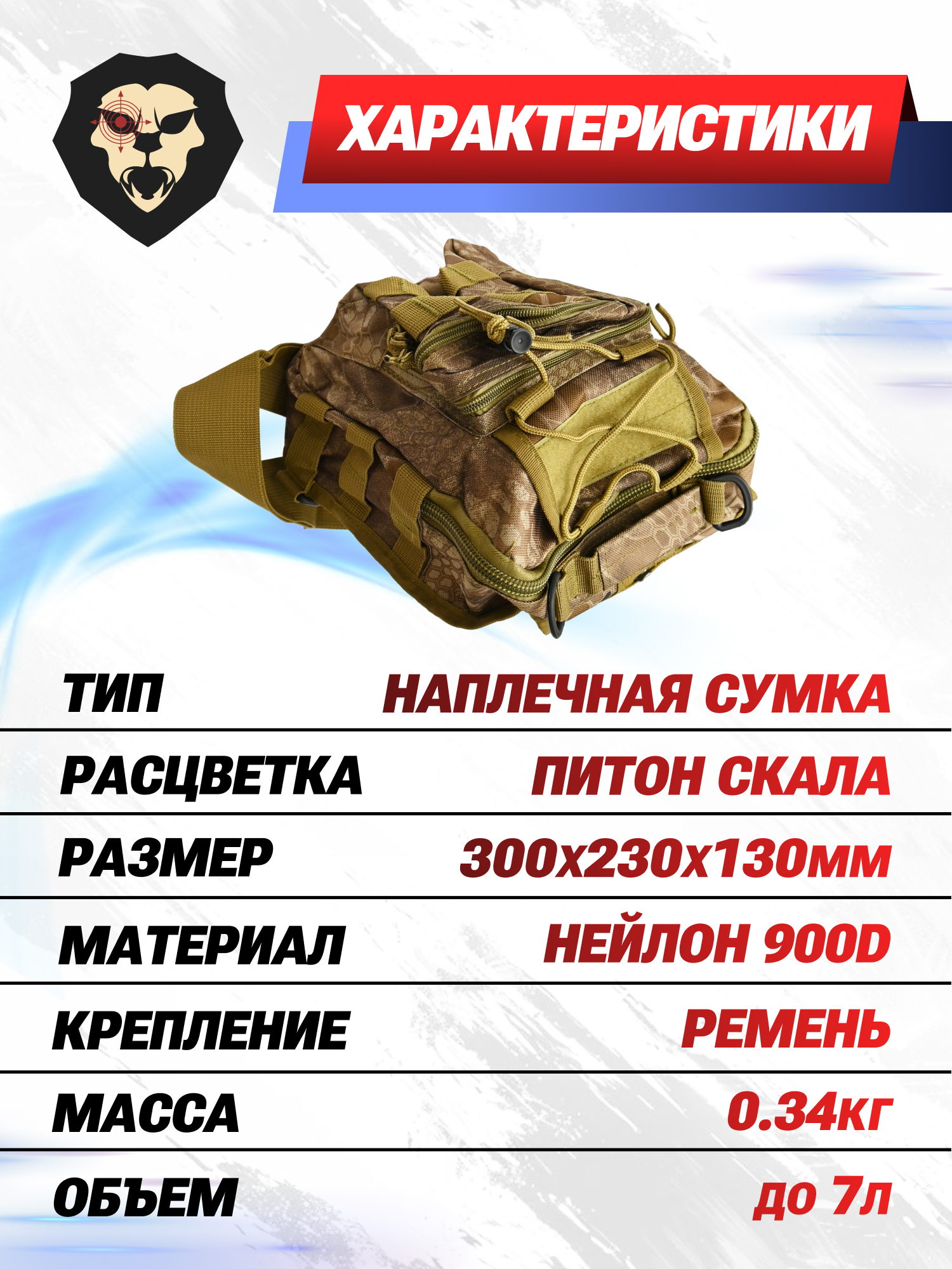 Информация о товаре "Сумка тактическая Brave Hunter PK098 (Питон, нейлон 900D)" носит ознакомительный характер, и не является публичной офертой, определяемой положениями Статьи 437 Гражданского кодекса Российской Федерации, характеристики, внешний вид, цвет и комплектация могут быть изменены производителем без уведомления.