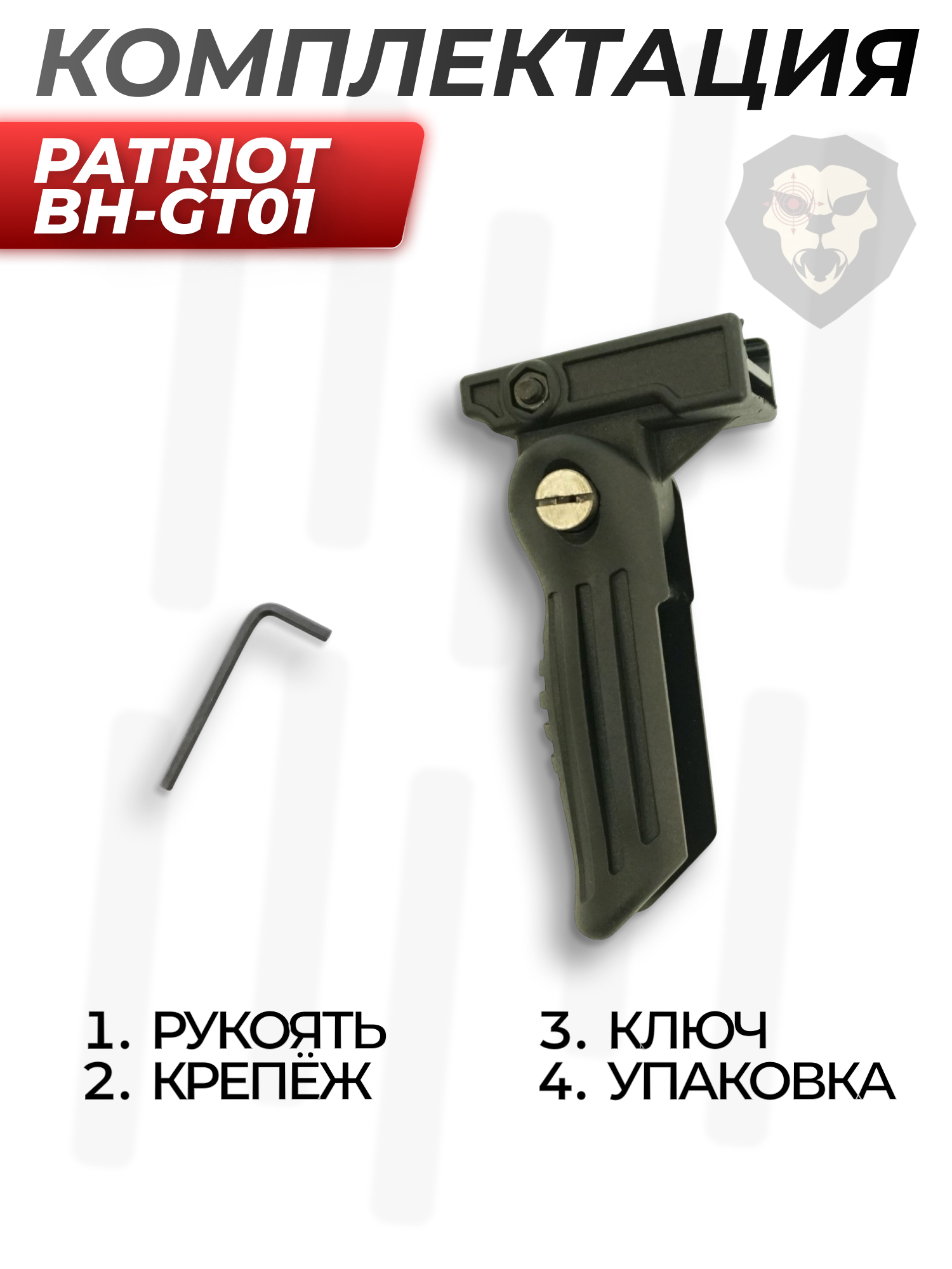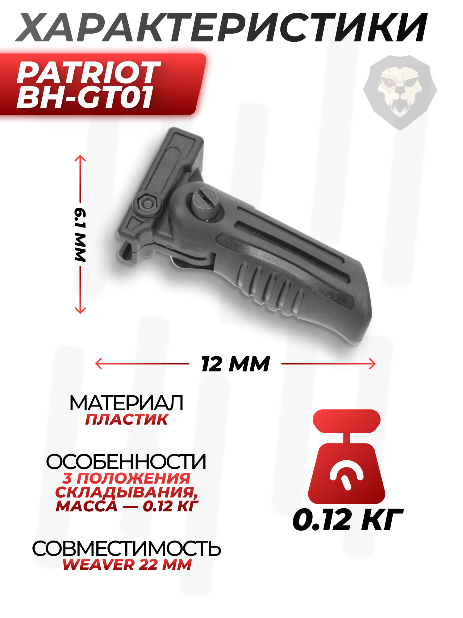 Артикул производителя BH-GT01 Тактическая рукоять Patriot BH-GT01 (Weaver, складная) по низкой цене 780 руб. Модель со штрихкодом производителя Вы можете оплатить наложенным платежем с доставкой или в отделении транспортной компании (ПЭК, СДЭК, Boxberry). Ваш заказ со штрихкодом 2000000048710 забрать на почте с оплатой при получении в любой части Российской Федерации.