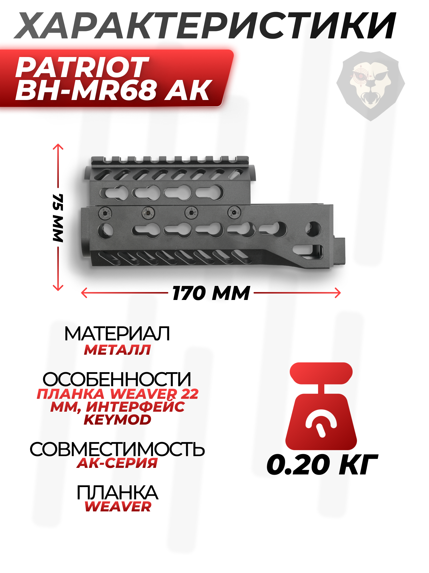 Артикул производителя BH-MR68 Тактическое цевье Patriot BH-MR68 для АК (Weaver, KeyMod) по низкой цене 8230 руб. Модель со штрихкодом производителя Вы можете оплатить наложенным платежем с доставкой или в отделении транспортной компании (ПЭК, СДЭК, Boxberry). Ваш заказ со штрихкодом 2000000118598 забрать на почте с оплатой при получении в любой части Российской Федерации.
