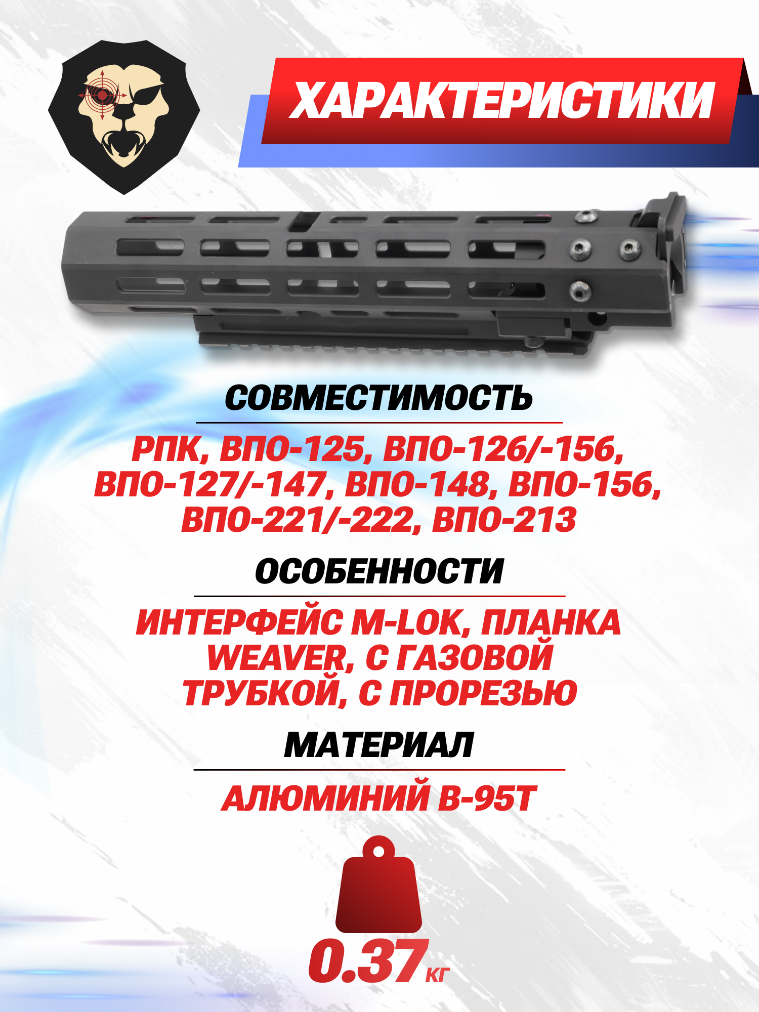 | Особенности | Интерфейс M-LOK, планка Weaver, с газовой трубкой, с прорезью |