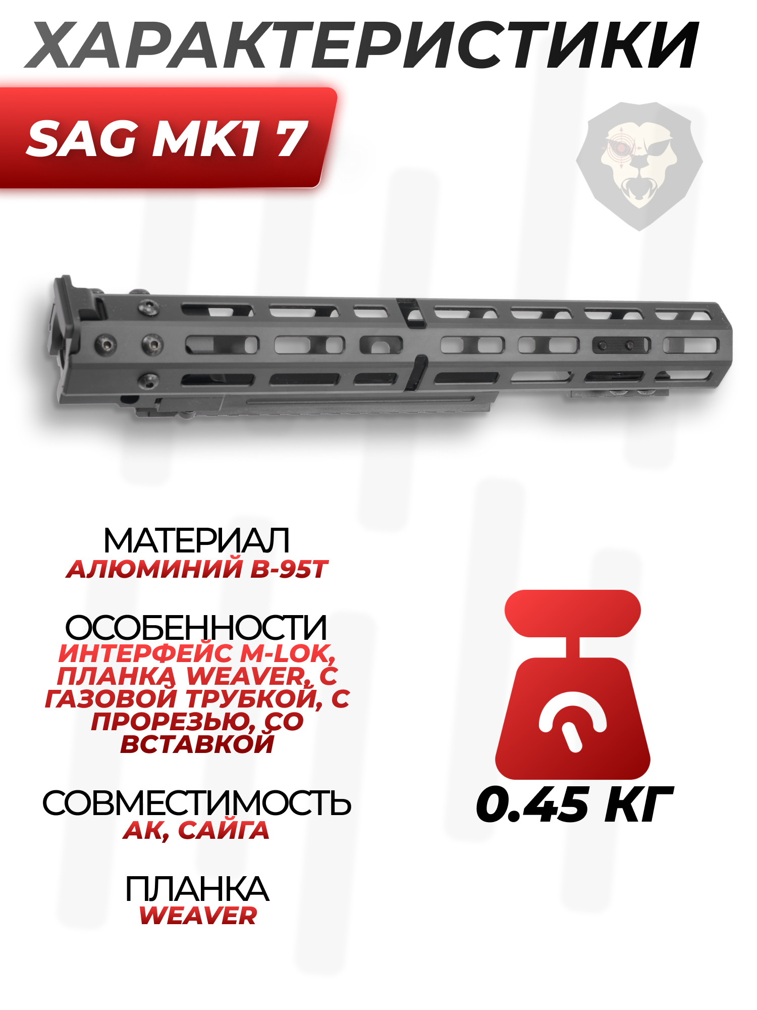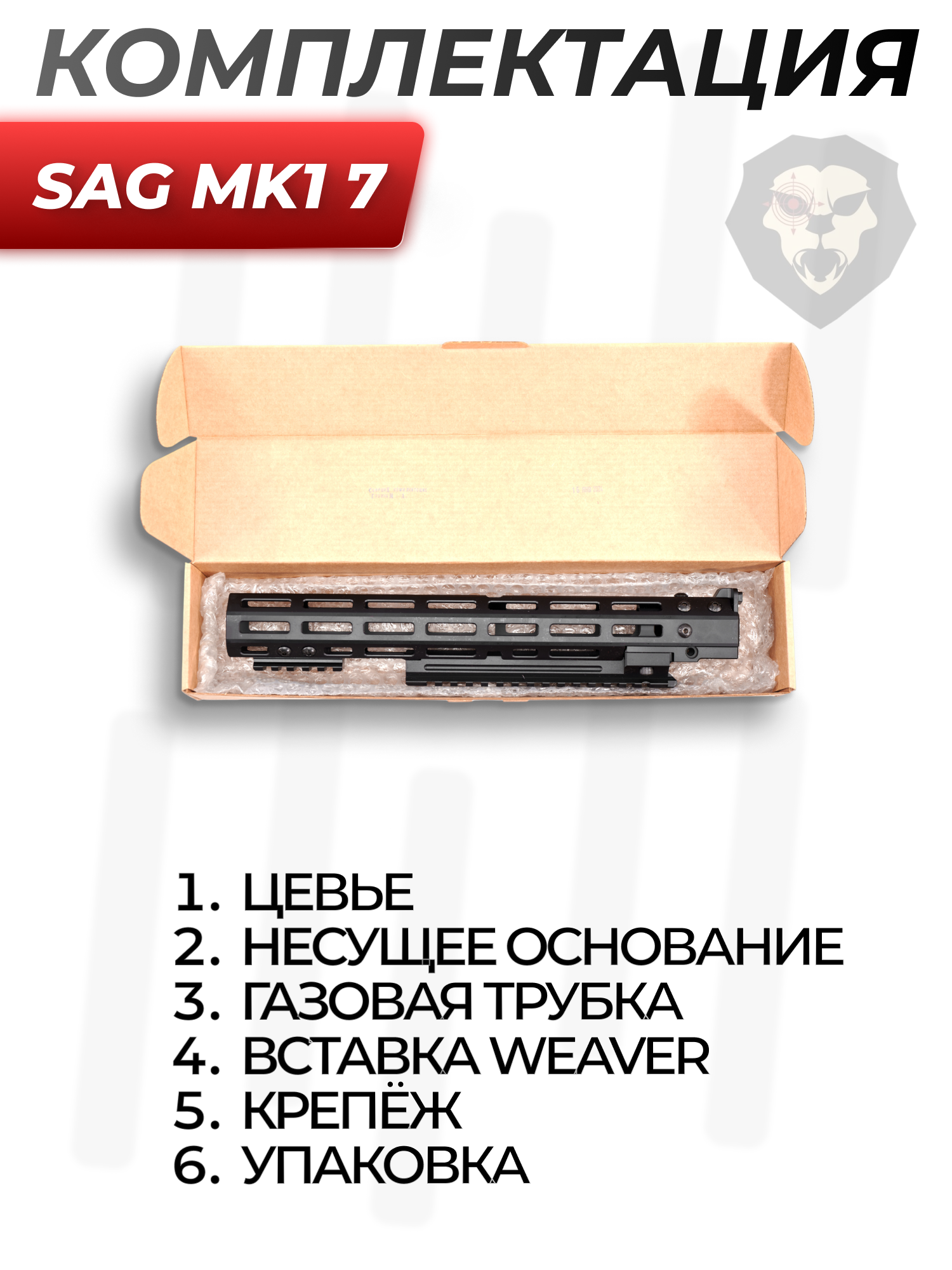 Облегченная сборная конструкция весит не больше 378 граммов. Цевье SAG чашечного типа не содержит выступающих элементов, а благодаря увеличенной длине удержание возможно не только обычным, но и спортивным хватом. При этом владелец может смонтировать любое навесное оборудование, совместимое со слотами M-LOK - в конкретном исполнении предусмотрено 7 рядов креплений.