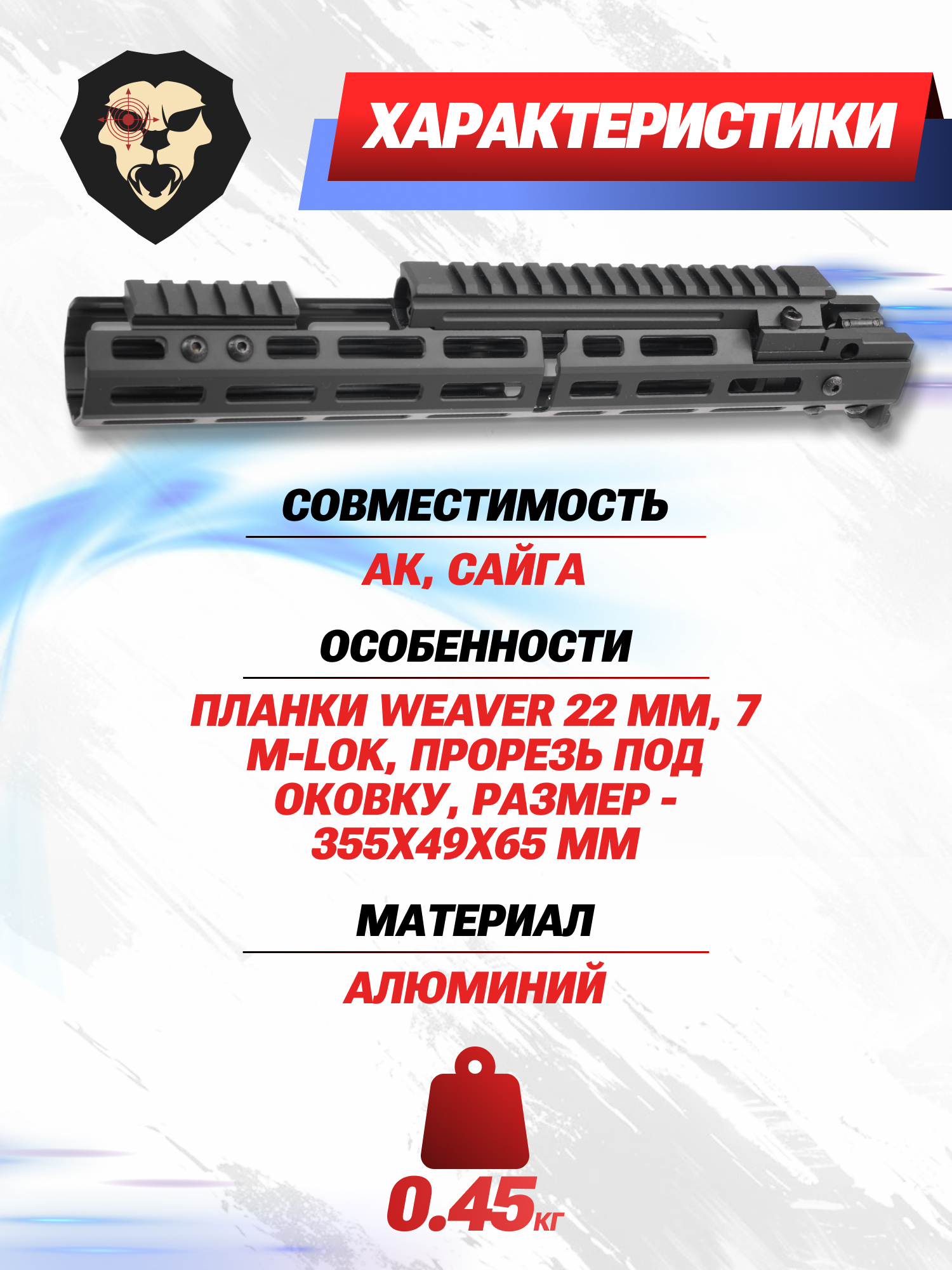| Особенности | Планки Weaver 22 мм, 7 M-LOK, прорезь под оковку, размер - 355x49x65 мм |