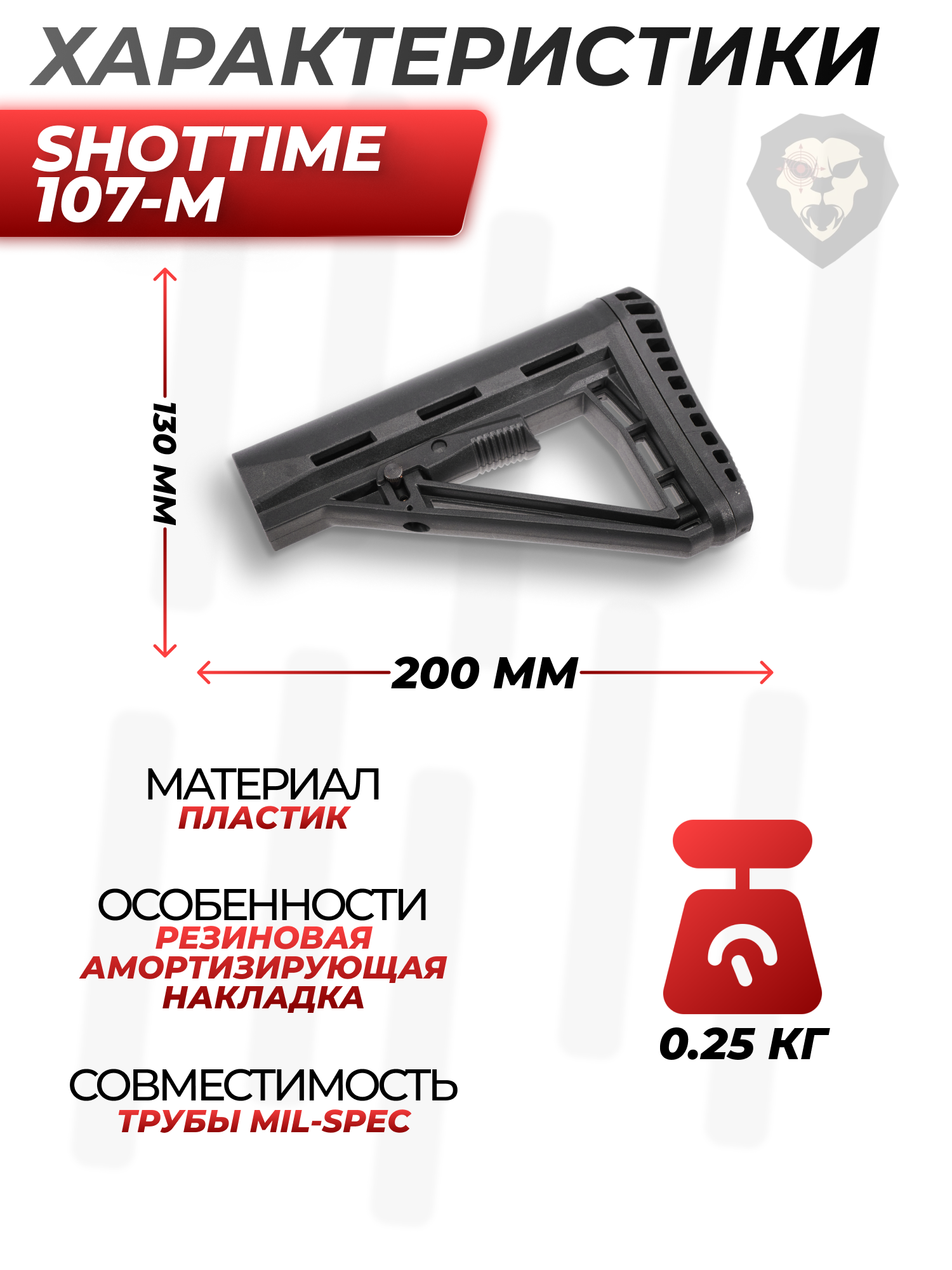 Артикул производителя ST-S-107-M Телескопический приклад ShotTime 107-M (Mil-Spec) по низкой цене 4490 руб. Модель со штрихкодом производителя Вы можете оплатить наложенным платежем с доставкой или в отделении транспортной компании (ПЭК, СДЭК, Boxberry). Ваш заказ со штрихкодом 2000000137322 забрать на почте с оплатой при получении в любой части Российской Федерации.