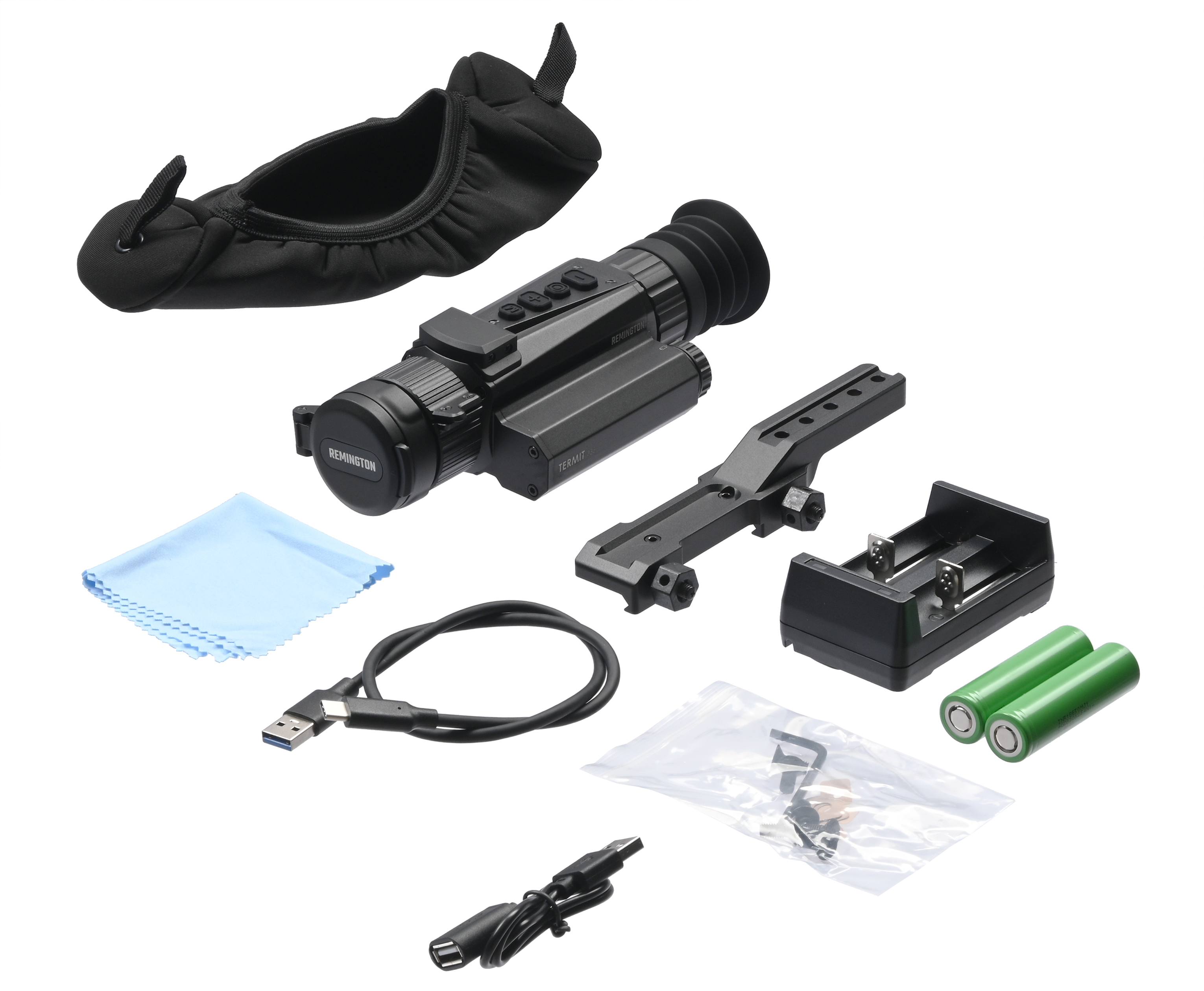 Автономность образца обеспечивается съемным аккумулятором типоразмера 18650 - в комплектации присутствует зарядное устройство для подзарядки батареек. Приблизительно тепловизионный прицел Remington Termit 335 способен проработать без перерывов до 5 часов. Подключение внешнего источника энергии выполняется за счет штатного кабеля, подключаемого к распространенному разъему USB Type-C.