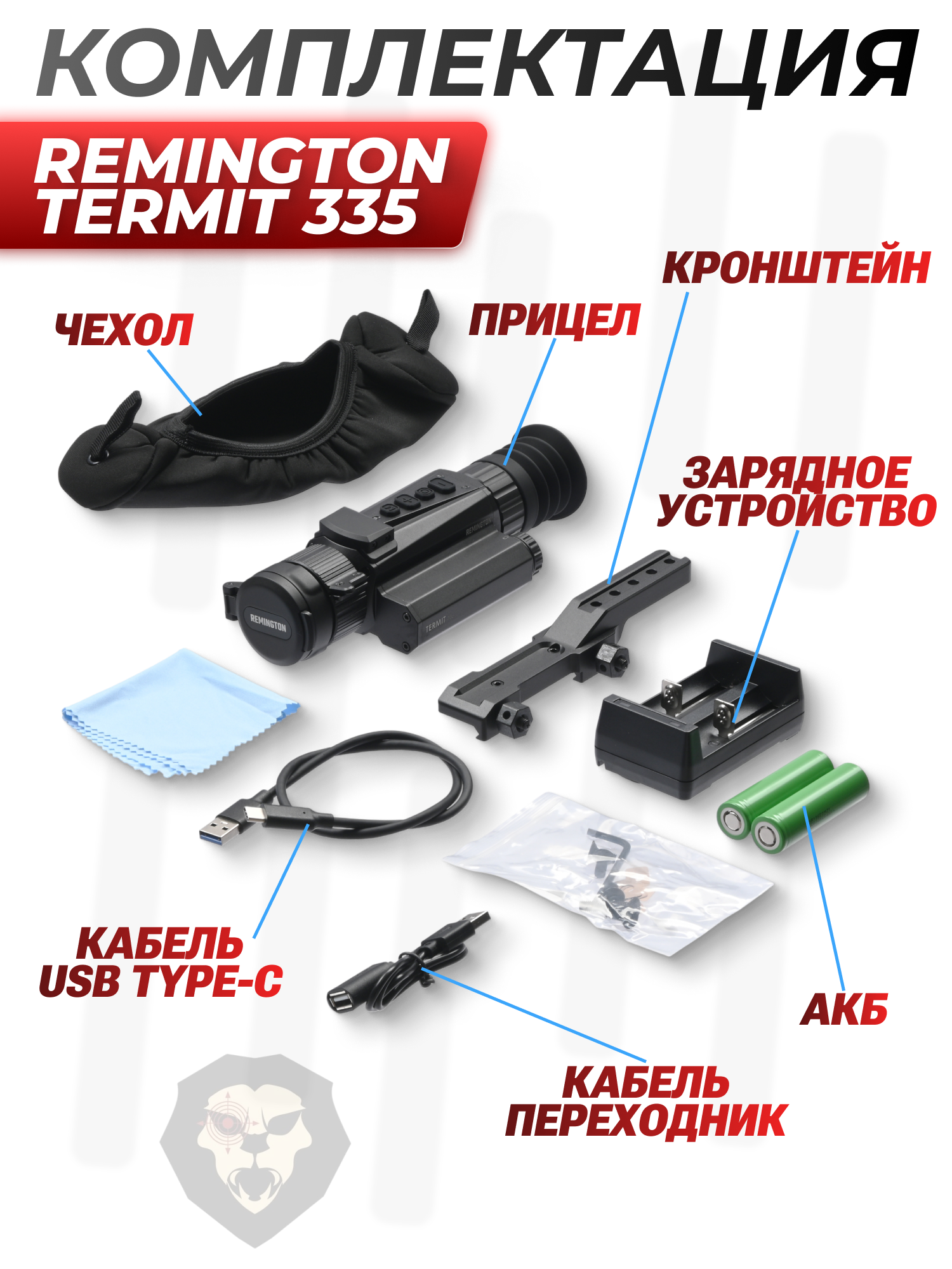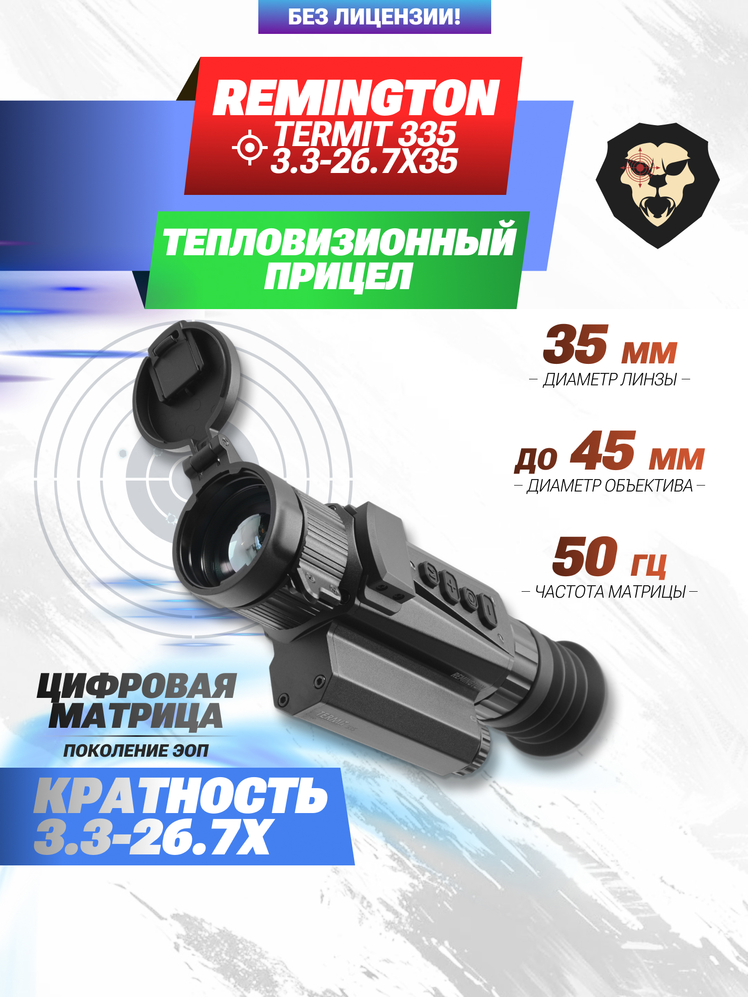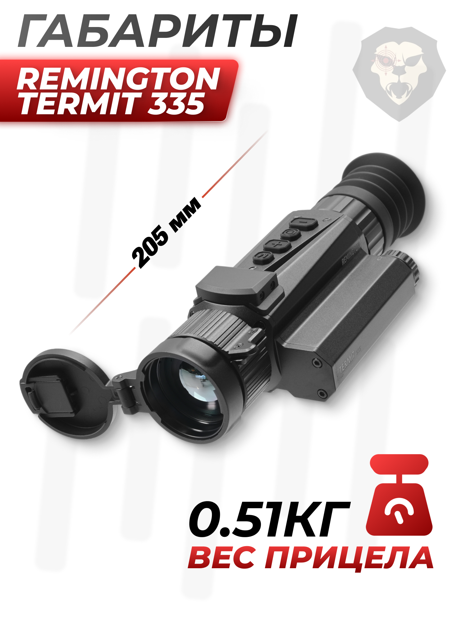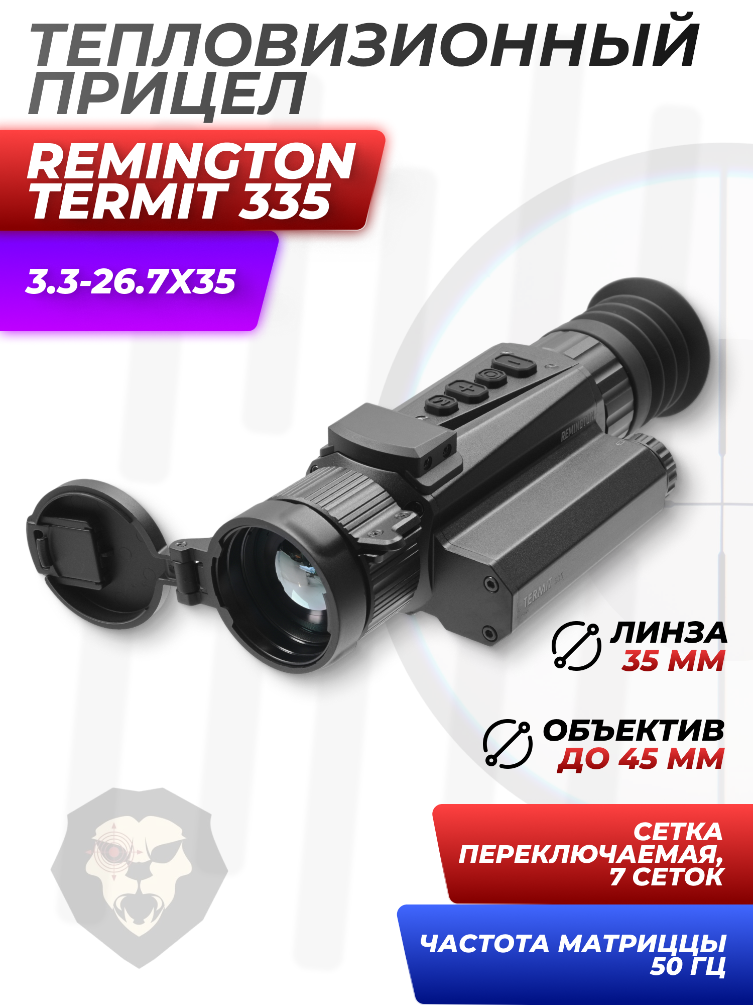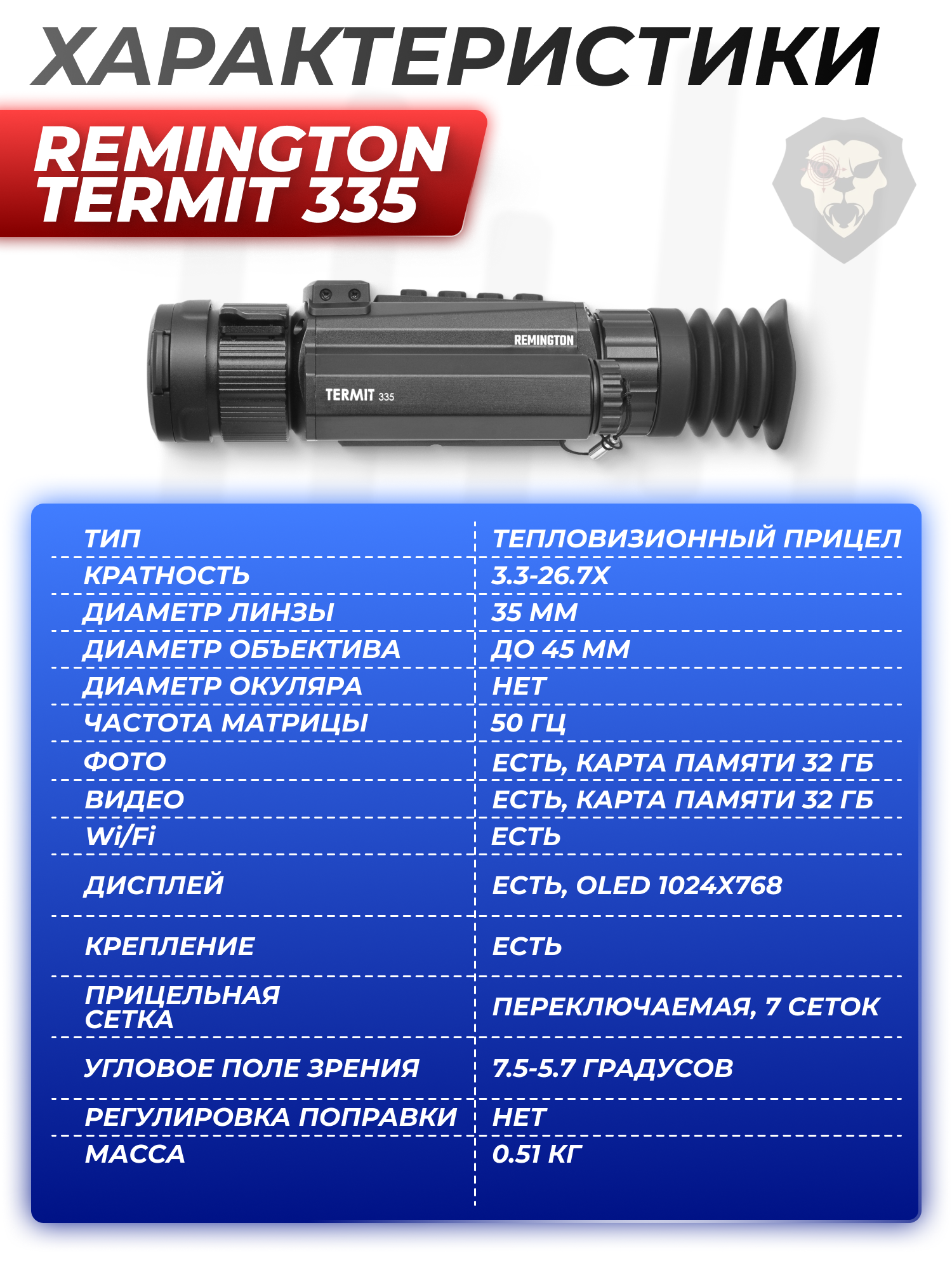 Информация о товаре "Тепловизионный прицел Remington Termit 335 3.3-26.7x35 (RT335, 18650, USB, Wi-Fi)" носит ознакомительный характер, и не является публичной офертой, определяемой положениями Статьи 437 Гражданского кодекса Российской Федерации, характеристики, внешний вид, цвет и комплектация могут быть изменены производителем без уведомления.