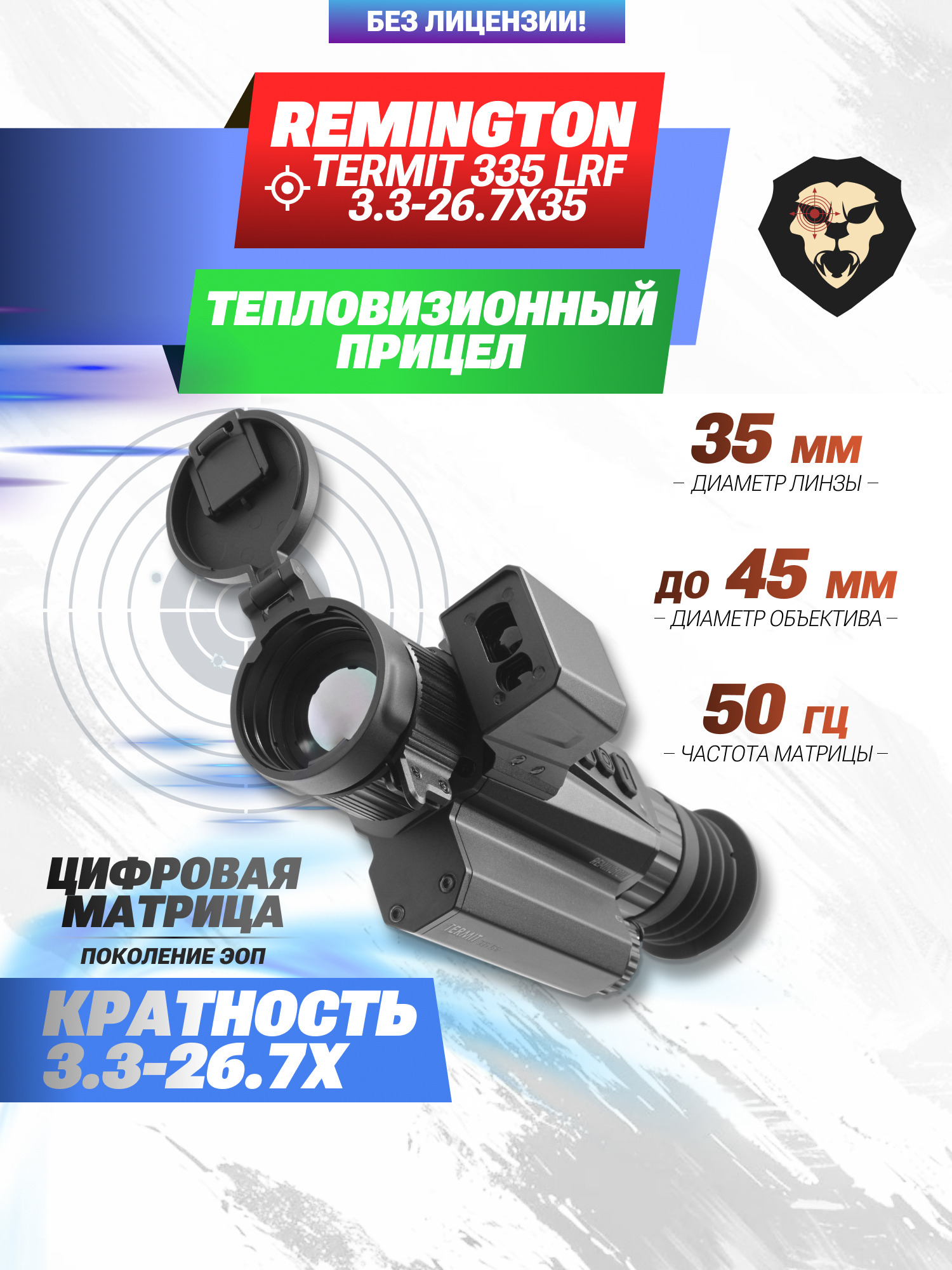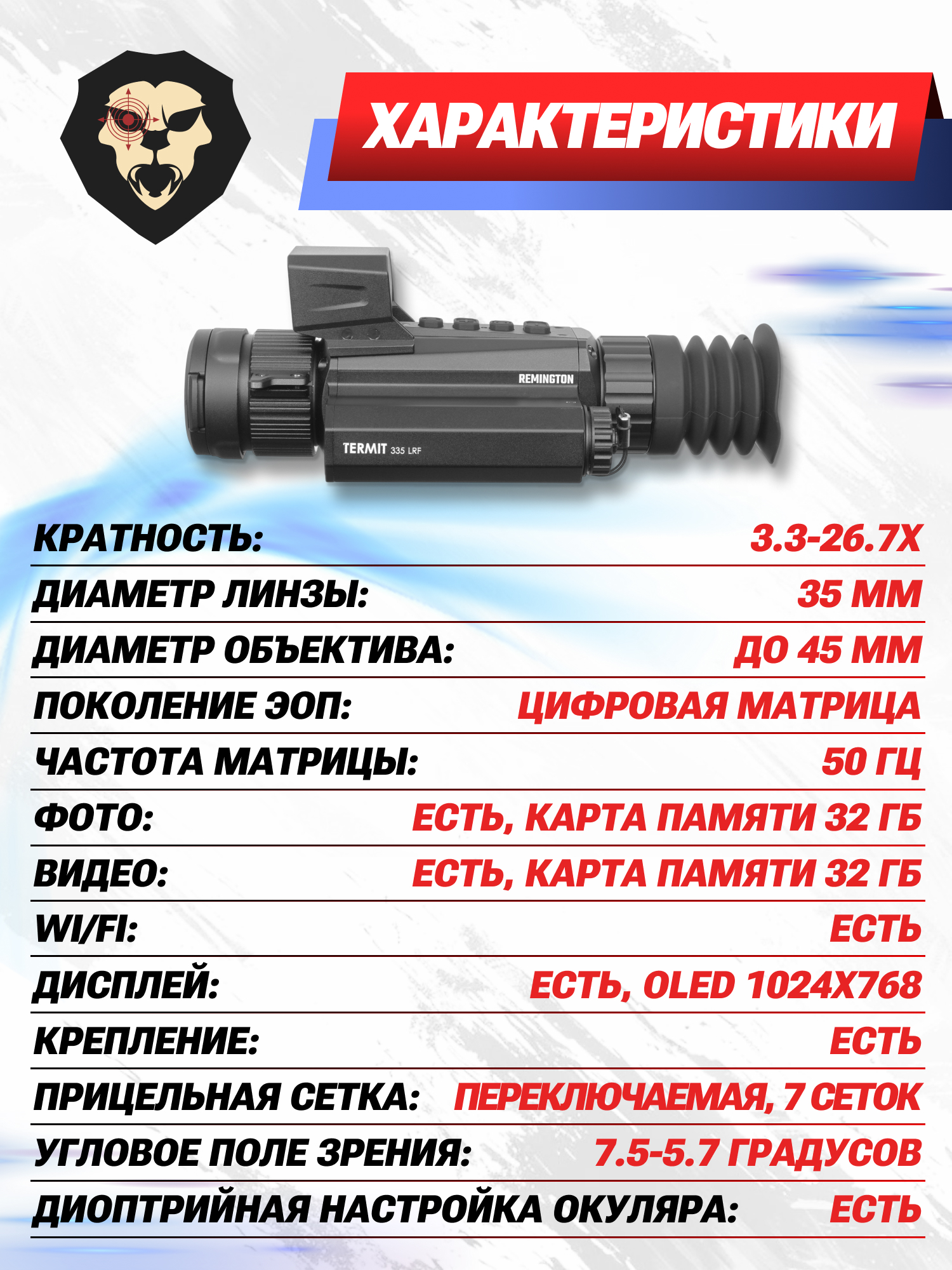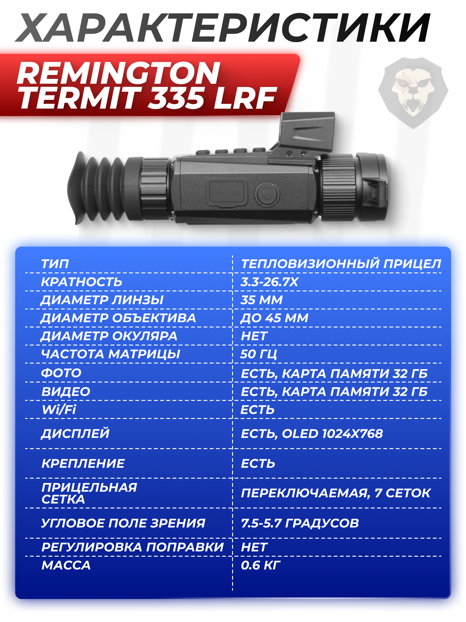 Информация о товаре "Тепловизионный прицел Remington Termit 335 LRF 3.3-26.7x35 (RT335LFR, USB, Wi-Fi, лазерный дальномер)" носит ознакомительный характер, и не является публичной офертой, определяемой положениями Статьи 437 Гражданского кодекса Российской Федерации, характеристики, внешний вид, цвет и комплектация могут быть изменены производителем без уведомления.
