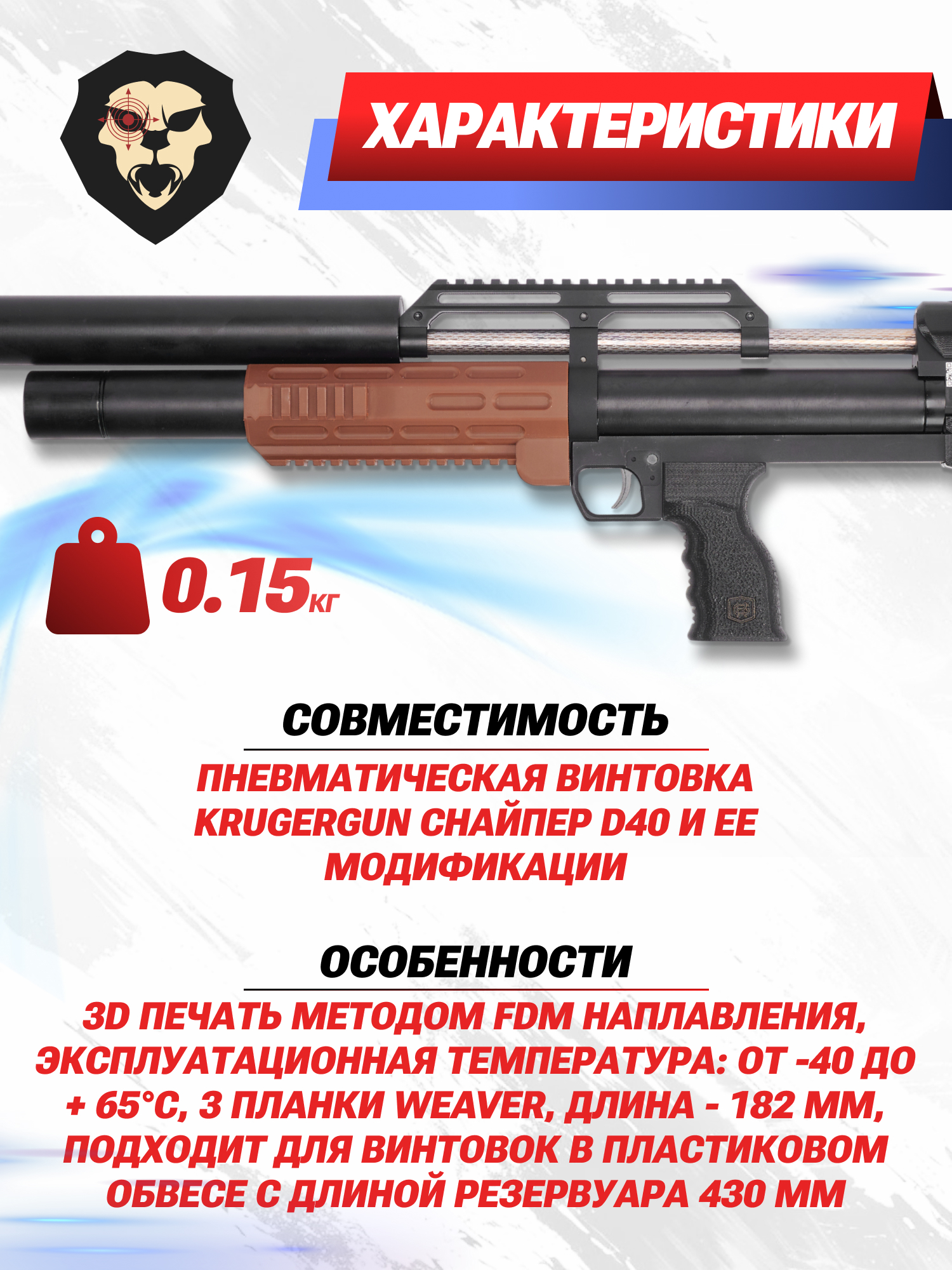 | Особенности | 3D печать методом FDM наплавления, эксплуатационная температура: от -40 до + 65°C, 3 планки Weaver, длина - 182 мм, подходит для винтовок в пластиковом обвесе с длиной резервуара 430 мм |