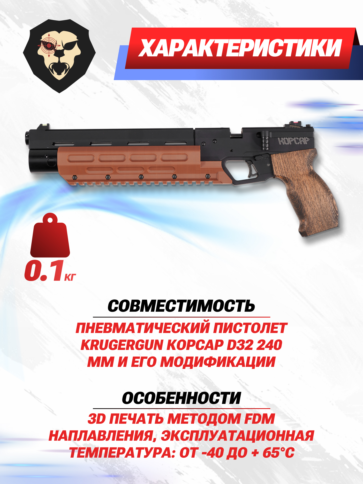 В процессе создания задействуется коричневый пластик - оттенок, как и исполнение в целом, может отличаться от представленного на фото варианта. Уменьшить шанс расхождения цвета тюнинга можно путем покупки комплекта обвесов - цевья в паре с прикладом на Корсар KrugerGun. Пистолет в набор не входит и приобретается отдельно.