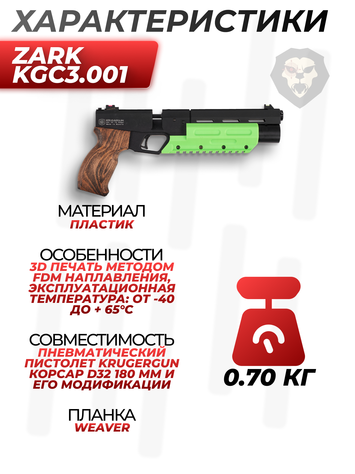 Для расширения функционала оружия используется всевозможный тактический обвес. Внешний тюнинг актуален и для пневматики. Современные способы производства позволяют создавать нестандартные аксессуары для «воздушек» различного типа - цевье Zark Arms обозреваемого образца разработано специально под пистолет КрюгерГан Корсар.
