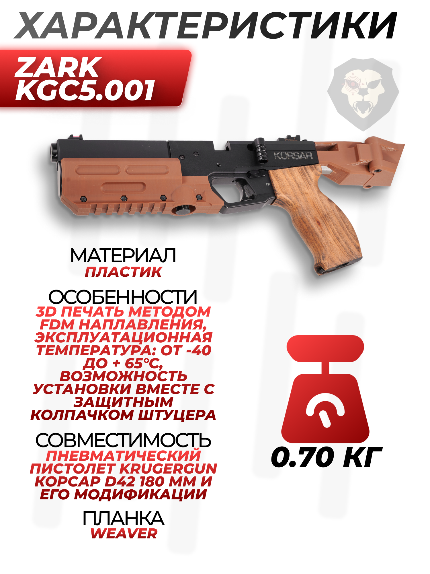 Цевье Zark Arms для KrugerGun Корсар Компакт изготавливается методом FDM 3D печати. Детали формируются путем послойного наплавления расплавленного пластика. В обозреваемом исполнении применяется полимер коричневого оттенка - в зависимости от партии цвет может незначительно отличаться от представленного на фото.