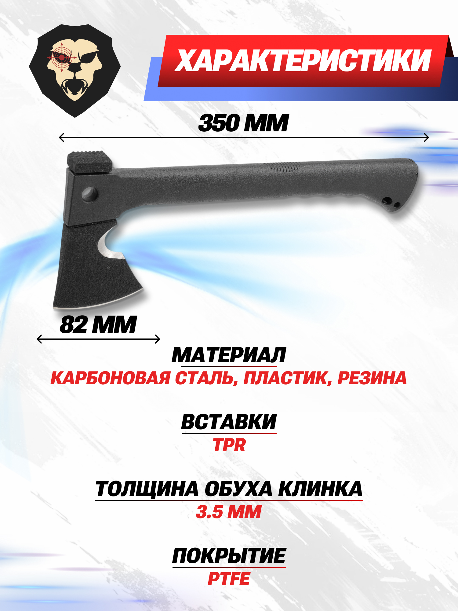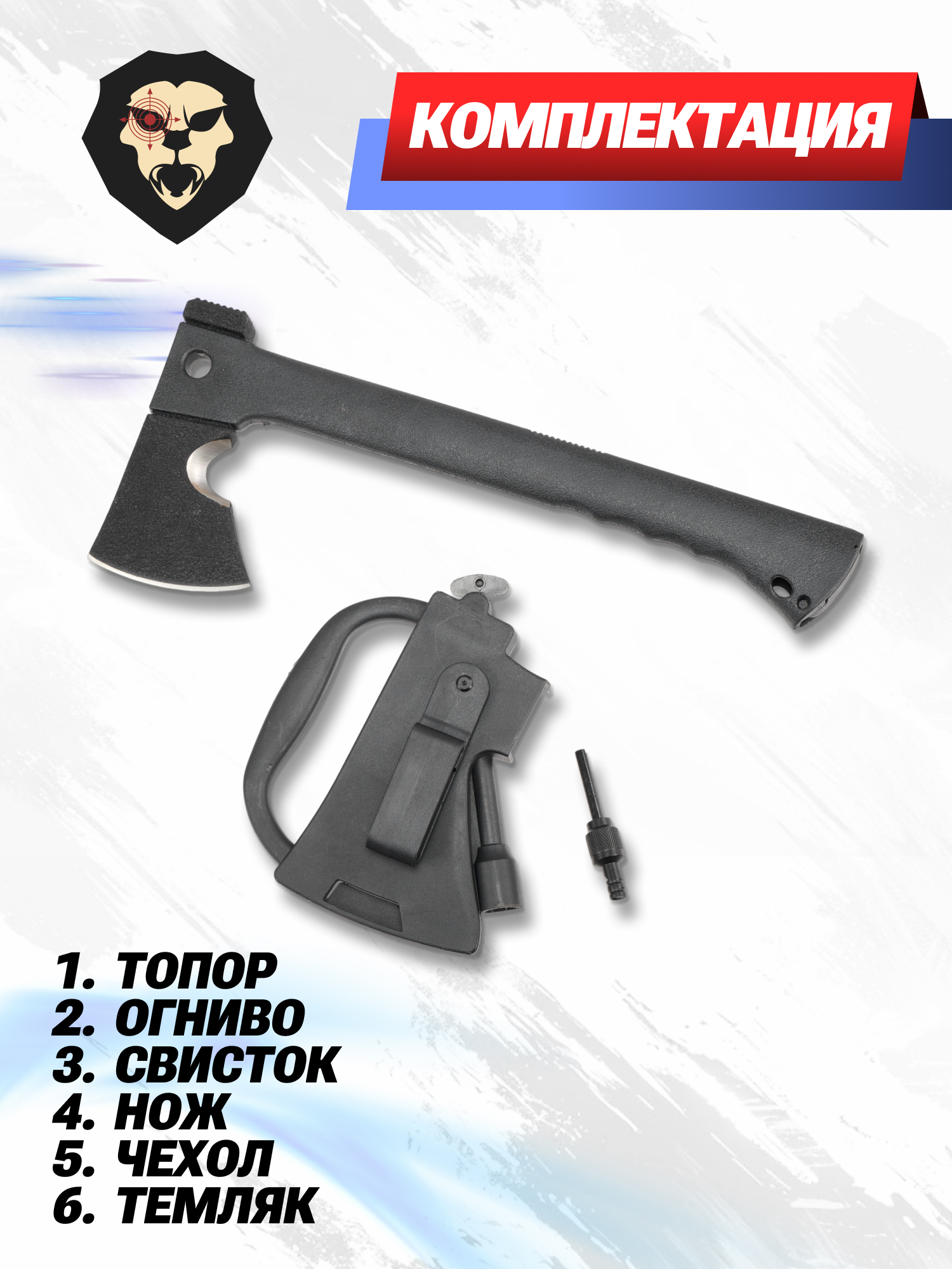 | Комплектация | Топор, огниво, свисток, нож, чехол, темляк упаковка |
