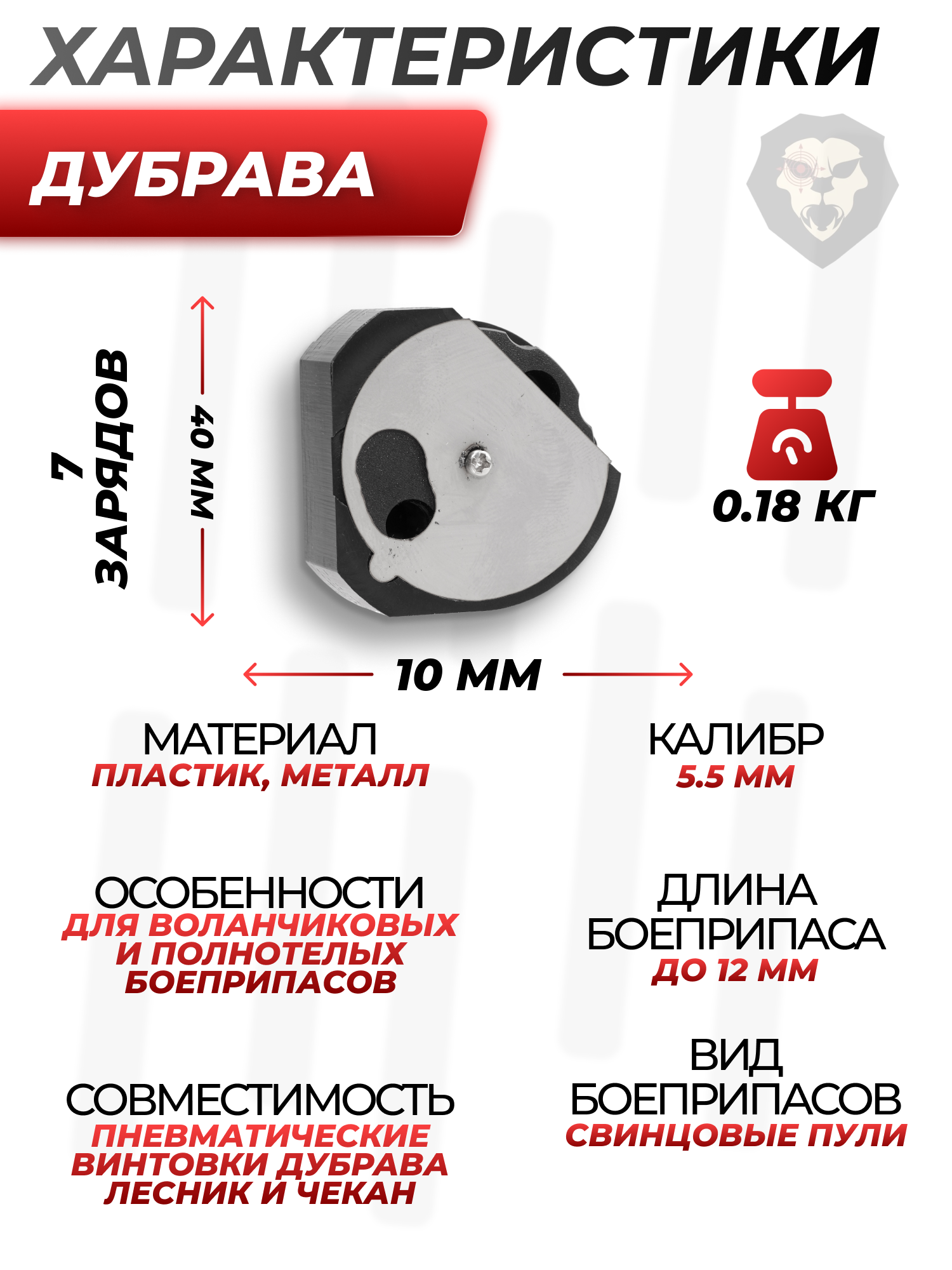 Информация о товаре "Барабанный магазин Дубрава 5.5 мм (7 пуль, универсальный)" носит ознакомительный характер, и не является публичной офертой, определяемой положениями Статьи 437 Гражданского кодекса Российской Федерации, характеристики, внешний вид, цвет и комплектация могут быть изменены производителем без уведомления.