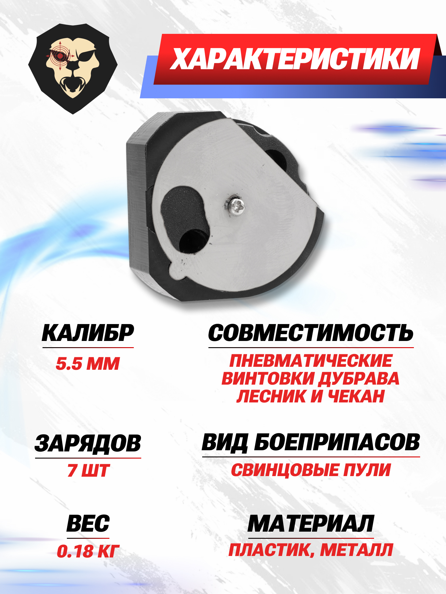 В стандартной комплектации РСР пневматика Дубрава поставляется на рынок с лотком на одно место для зарядки пуль. Однако для комфортной эксплуатации и увеличения боезапаса допускается использование барабанных магазинов. Им выступает рассматриваемый образец, который совместим с такими моделями, как Чекан и Лесник калибра 5.5 миллиметра.