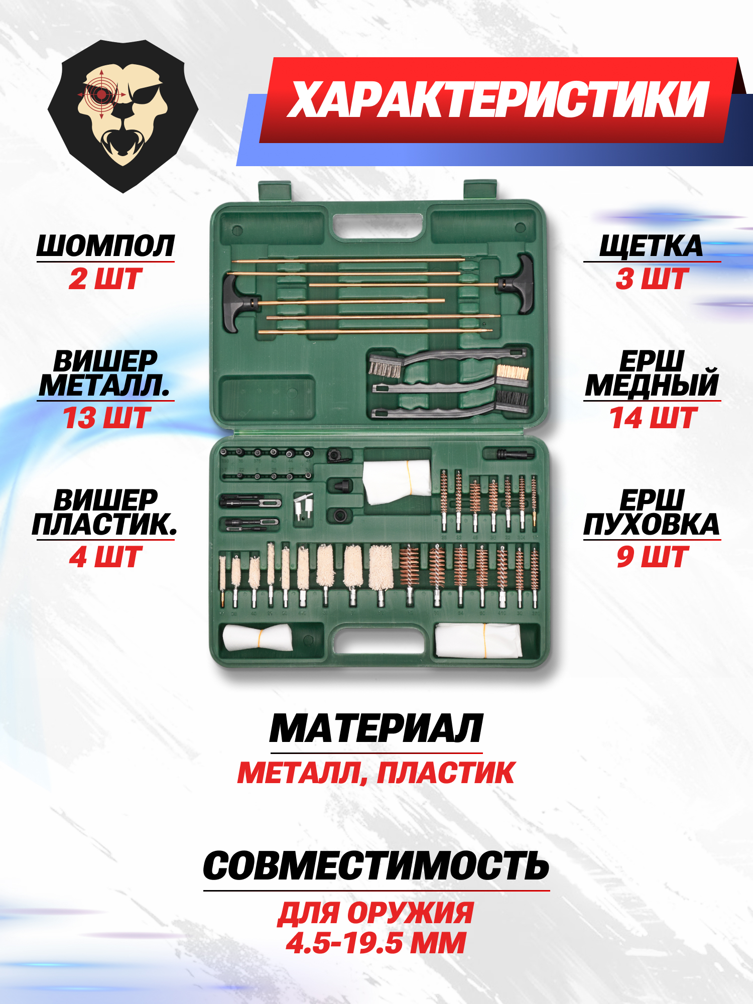 В кейс поместили два шомпола, состоящие из трех частей и оборудованы ручками с Т-образной формы. В наборе присутствуют пять насадок для обработки и войлочные тряпки к ним. Ветоши в количестве 100 штук хватит, чтобы оттирать загрязнения и смазывать оружие на протяжении нескольких десятков выездов на стрельбище.