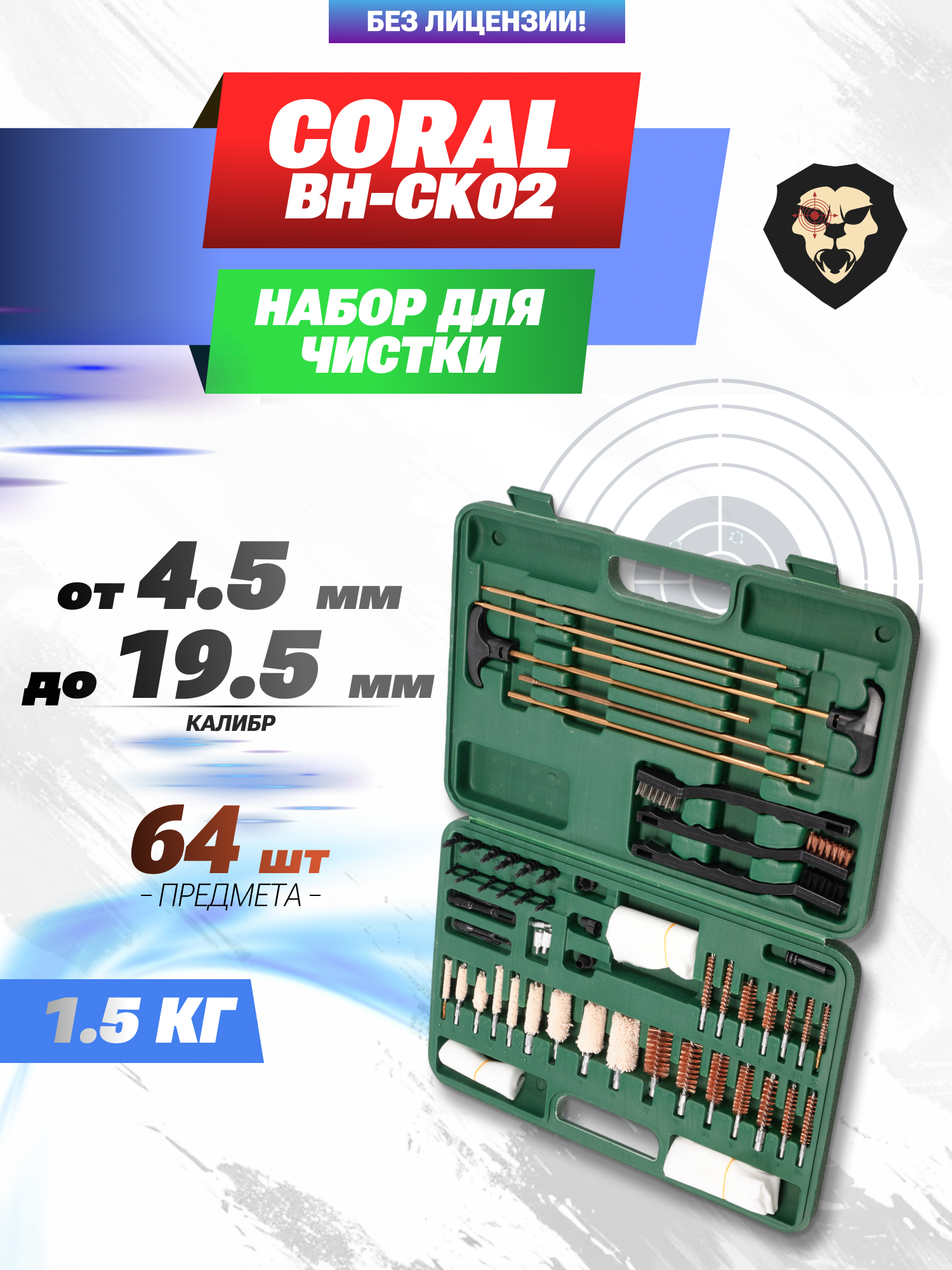 Компания Coral, производящая внешние, внутренние модификации и расходники для винтовок, выпустила набор для чистки оружия универсальный BH-CK02 64 предмета. Он помещен в ударопрочный кейс зеленого цвета и содержит в себе все инструменты для планового обслуживания, которые размещены в отведенные выемки, чтобы сохранить целостность компонентов при транспортировке.