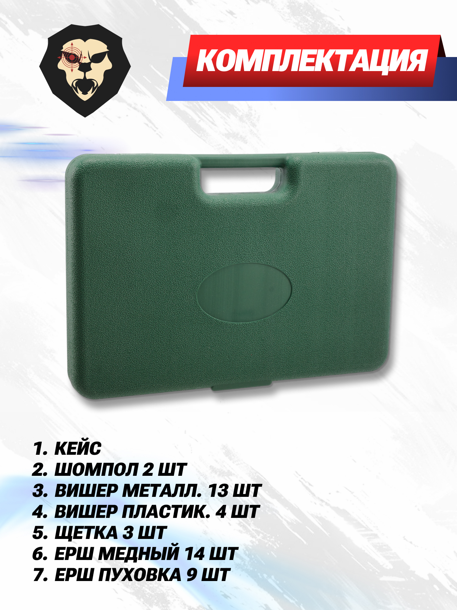 | Комплектация | Кейс, шомпол - 2 шт, вишер металлический - 13 шт, вишер пластиковый - 4 шт, щетка - 3 шт, ерш медный - 14 шт, ерш пуховка - 9 шт, салфетка - 100 шт, упаковка |