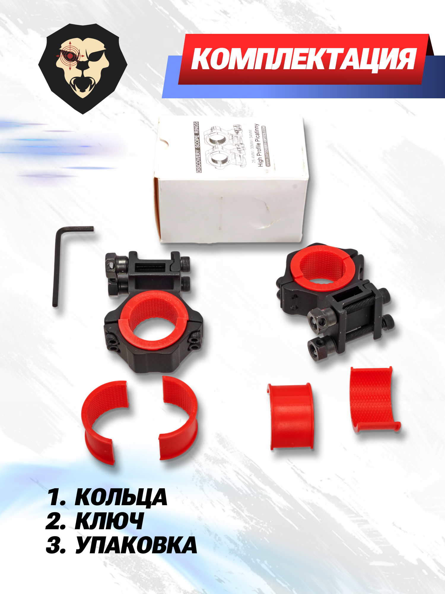 Кольца от фирмы Discovery Optics выпускаются с различной высотой основания. Конкретные монтажные элементы обладают увеличенным профилем, позволяя закреплять прицелы с широкоформатными объективами большого размера. Основание креплений совместимо с рельсовыми направляющими стандарта Weaver, а удержание на планке выполняется за счет двух фиксирующих винтов.