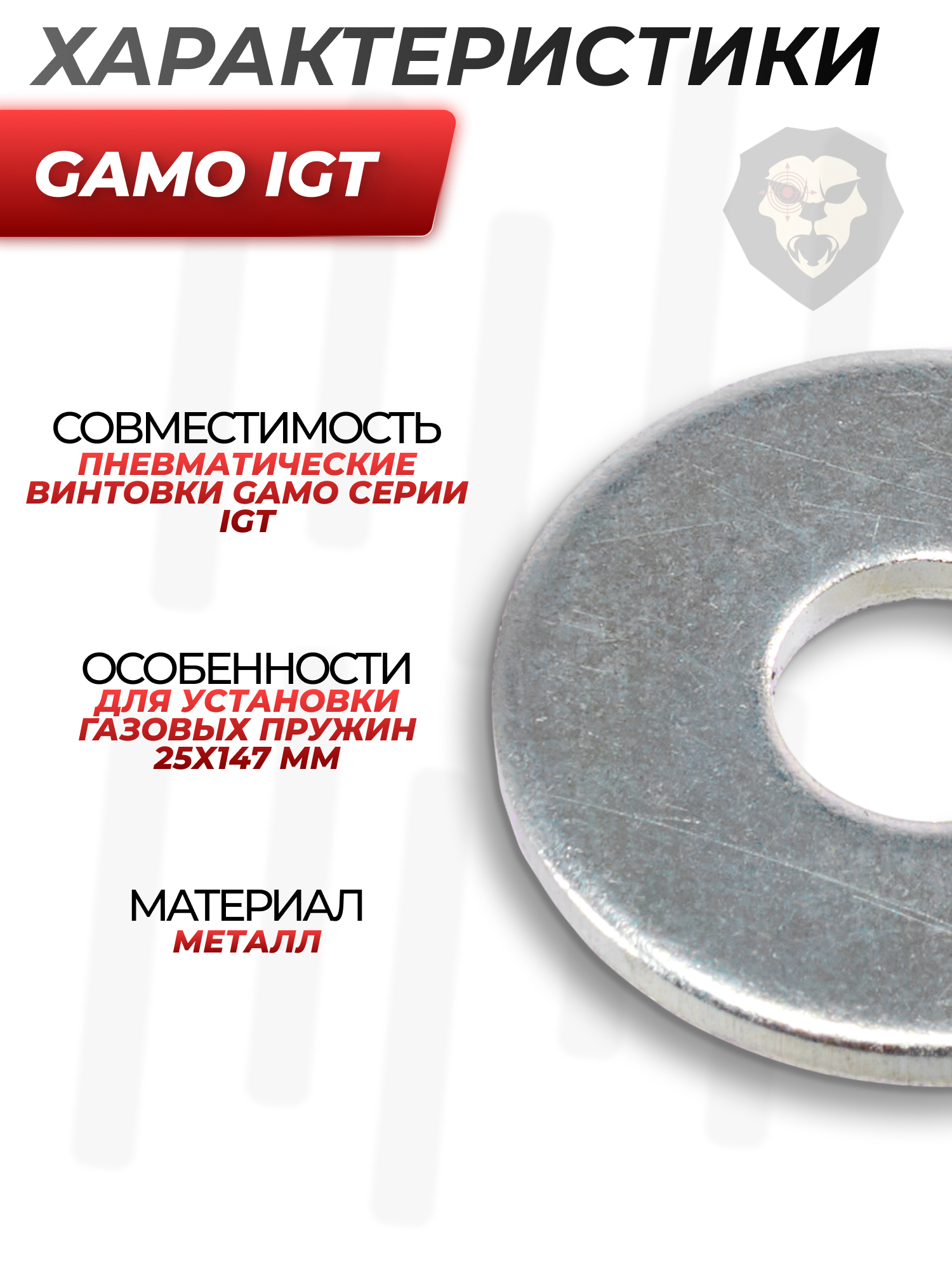 Экземпляр рассчитан на газовые пружины Gamo и аналоги от других изготовителей типоразмера 147x25 мм. Шайба вытачивается из прочного металла и выделяется толщиной один миллиметр. Внешний диаметр при этом составляет 2 сантиметра.