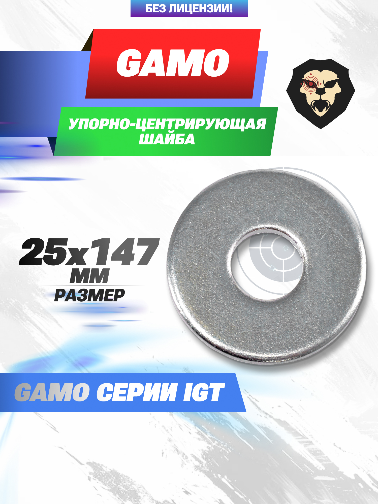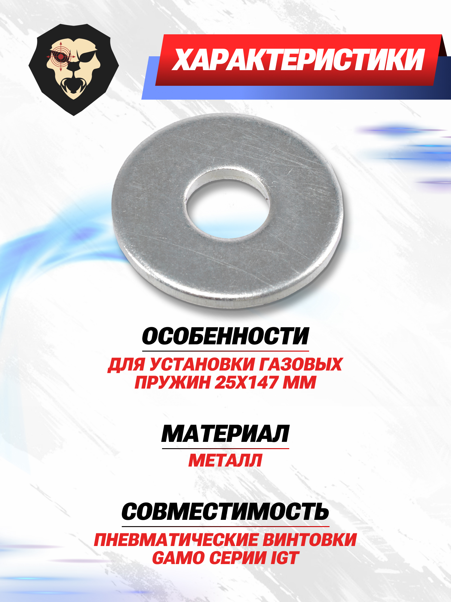 Экземпляр рассчитан на газовые пружины Gamo и аналоги от других изготовителей типоразмера 147x25 мм. Шайба вытачивается из прочного металла и выделяется толщиной один миллиметр. Внешний диаметр при этом составляет 2 сантиметра.