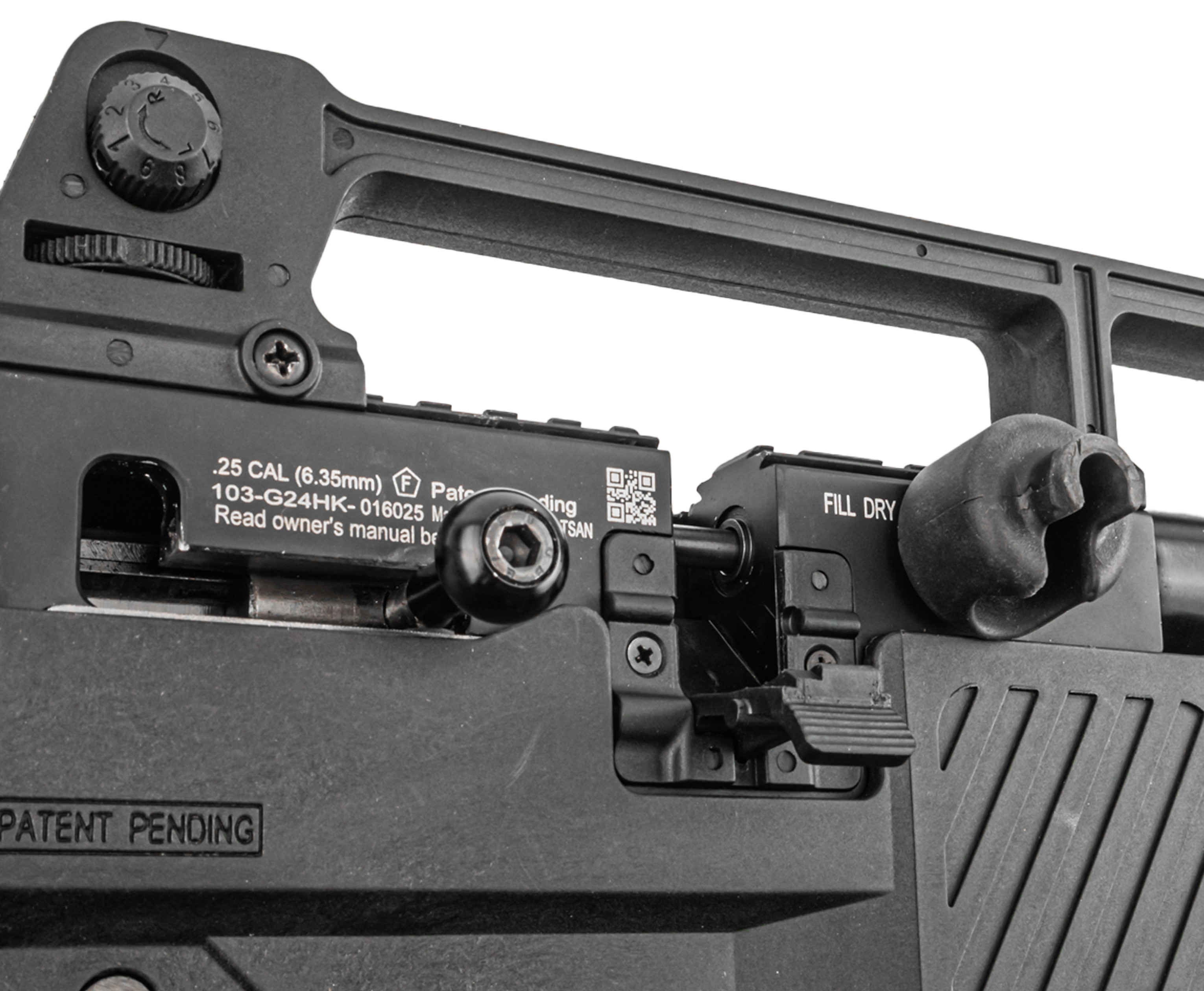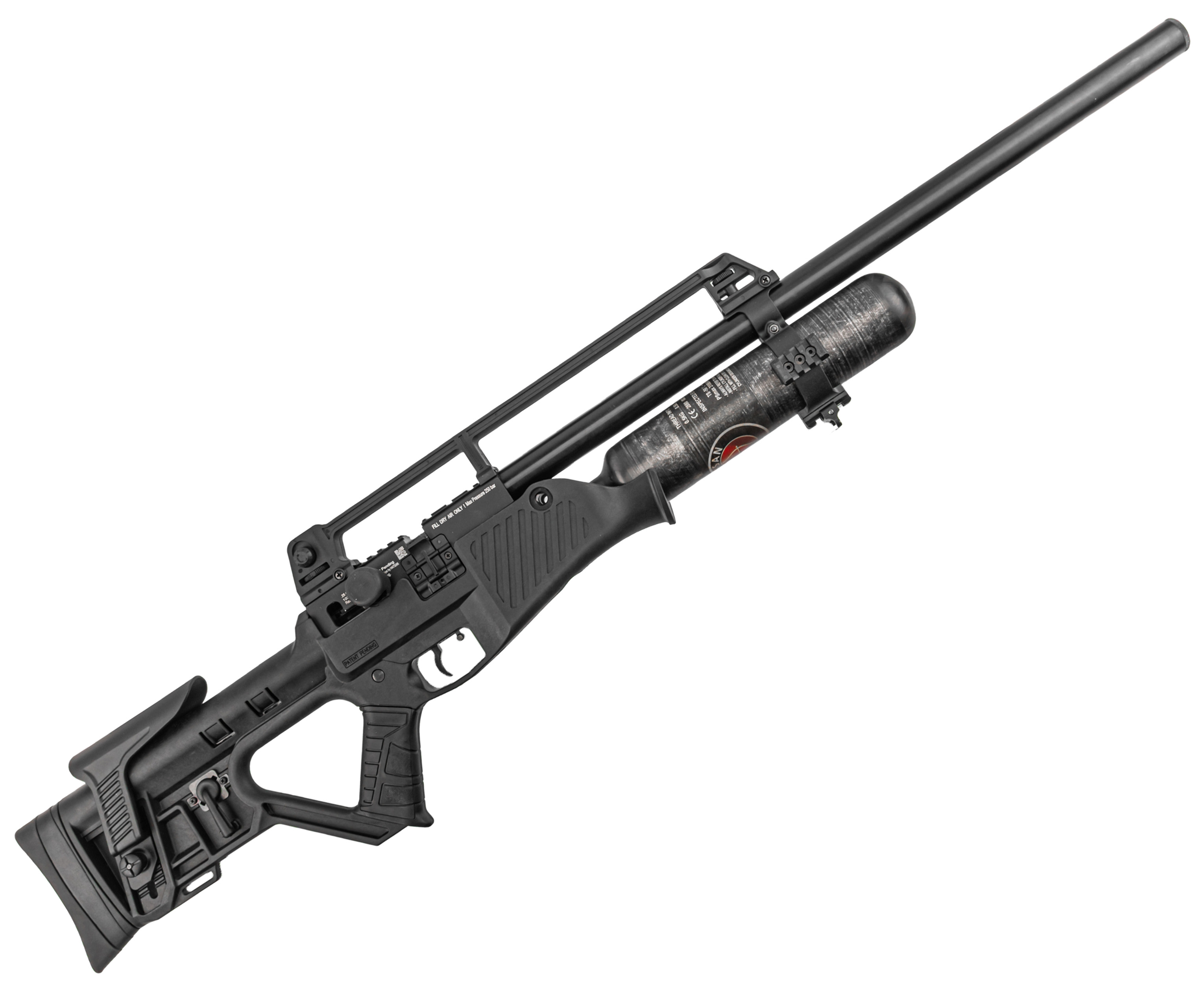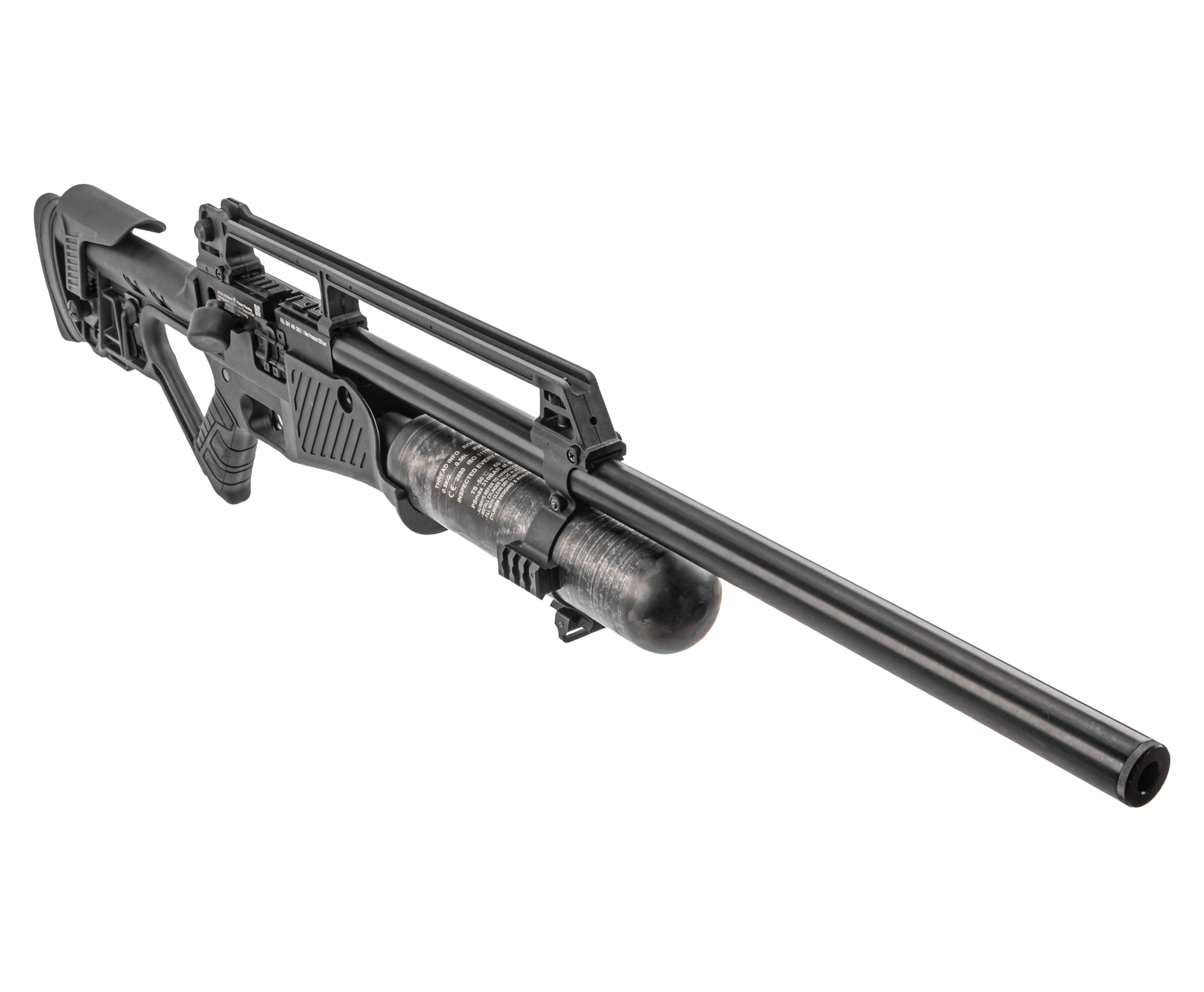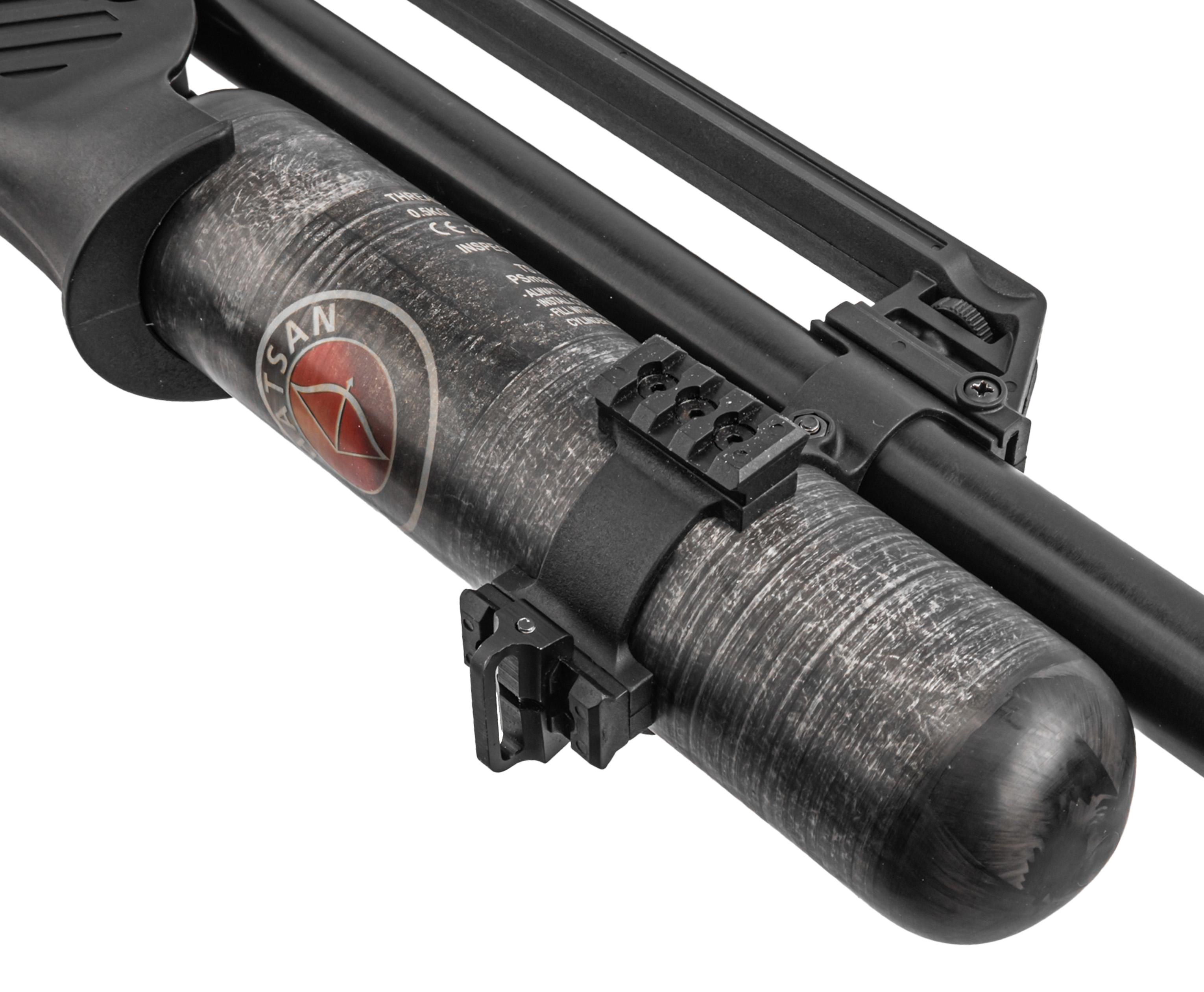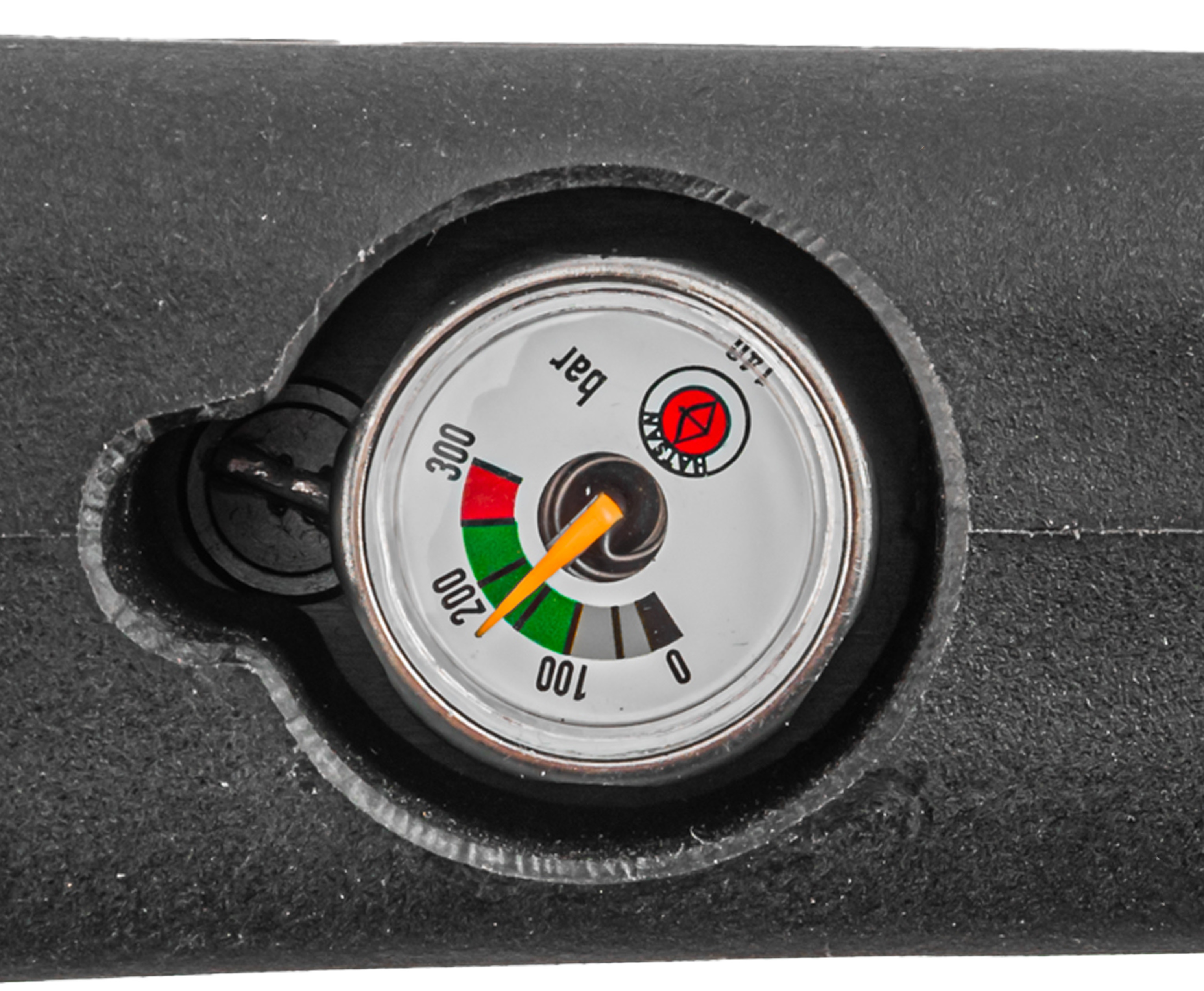 Сама колба выполнена из композитного материала, что положительно сказывается на балансе оружия и его массе - инженерам удалось удержать показатель веса в пределах 4 кг. Ресивер при этом спокойно держит давление до 250 Бар. Рекомендуется соблюдать рекомендованный порог во избежание чрезмерного износа уплотнителей - отслеживать текущее состояние помогает интегрированный манометр.