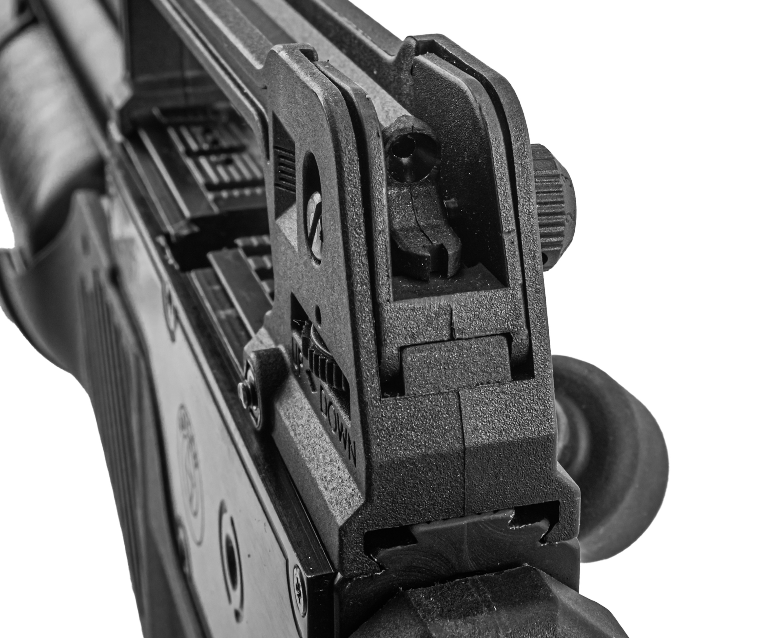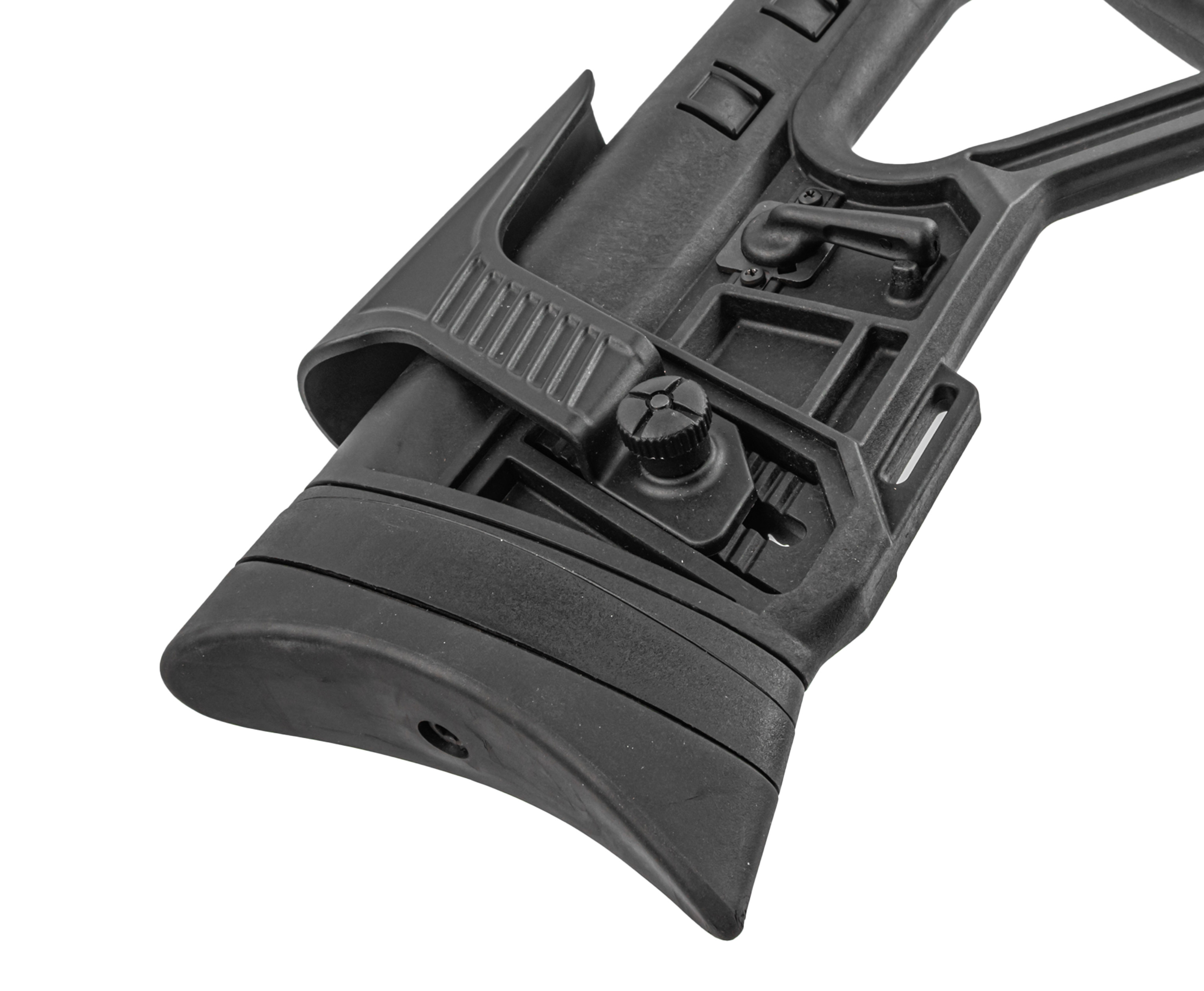 Для комфортного удержания и корректной вкладки модель имеет полноценную пистолетную рукоять и тактический приклад. Фурнитура выполнена из ударопрочного полимера. Ладонь не скользит при хвате из-за насечек, при этом подщечник можно отрегулировать по высоте.